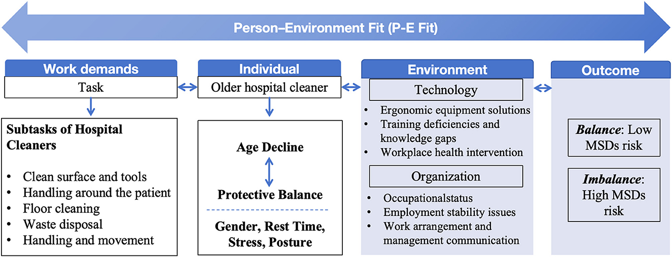 This systematic review synthesized available evidence on musculoskeletal disorders among older hospital cleaners aged 50 years and above. Across 11 studies, MSD prevalence ranged from 49.1% to 68.96%, with the lower and upper back being the most affected regions. Based on the available evidence, this review proposed a preliminary conceptual model based on P-E Fit theory to understand the complex interactions between individual and environmental factors affecting MSDs in older hospital cleaners. However, further empirical research is needed to validate this theoretical framework in the future. To ensure sustainable employment for older hospital cleaners, task design and assignment require greater attention to achieve optimal person-environment fit (90). Guided by the P-E Fit theory, the findings reveal that the development of MSDs in this population results from the interaction between work demands, individual capacity, and environmental conditions.