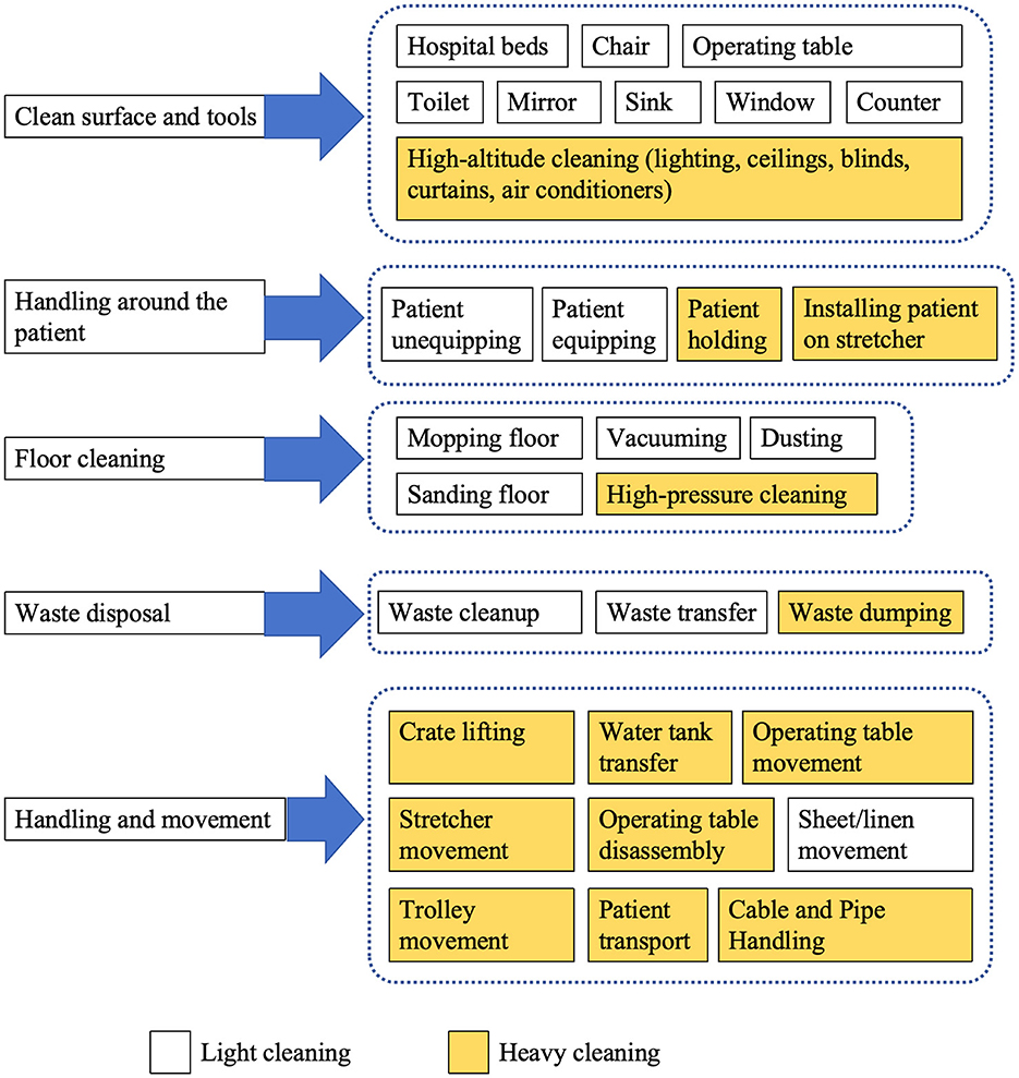 Given the lack of consensus regarding hospital cleaners' work tasks, we synthesized findings from multiple studies to identify five main categories of hospital cleaning tasks: surface and tool cleaning, handling around patients, floor cleaning, waste disposal, and handling and movement (Figure 3).
