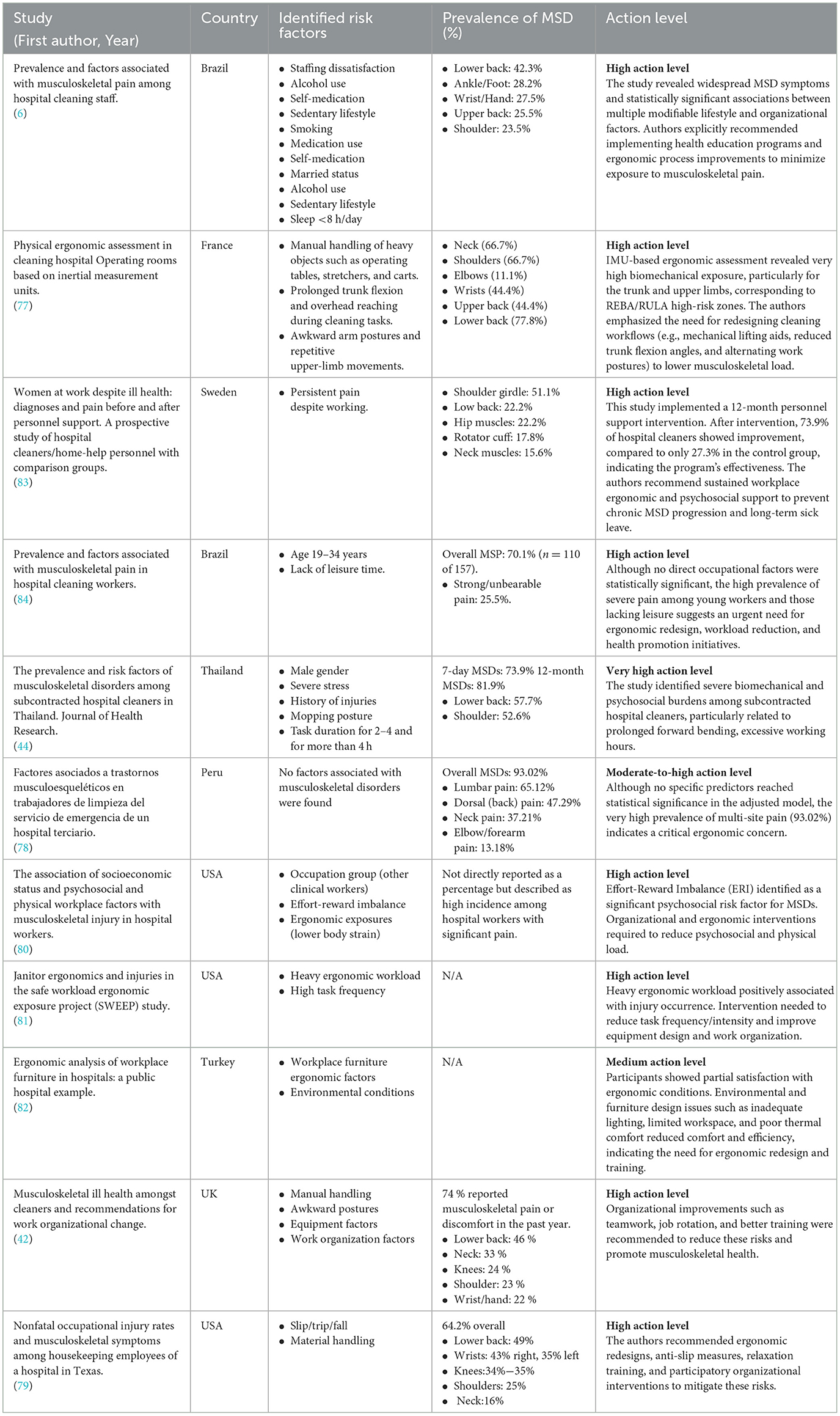 Given their increasing numbers and combined exposure to multiple risk domains, MSDs pose a critical occupational-health challenge for hospital cleaners (6, 43, 44). Healthcare cleaning personnel bear substantial responsibility for disrupting infection-transmission chains (6, 36, 45–47). Consequently, they must perform cleaning tasks at higher frequencies, with high-risk hospital areas sometimes requiring cleaning every 4 h (48). Moreover, the 24-h operation demands of hospitals necessitates prolonged and irregular shifts, further elevating musculoskeletal risk compared with cleaners in other environments (44). In routine operations, their standard duties include preparing cleaning products and sanitizing various surfaces throughout the hospital (44, 49). These tasks involve high physical demands, including prolonged standing, repetitive movements, distance walking, and sustained cardio-respiratory exertion (50). This growing demographic shift underscores an urgent need to understand the prevalence and risk factors of MSDs within this essential yet understudied workforce.