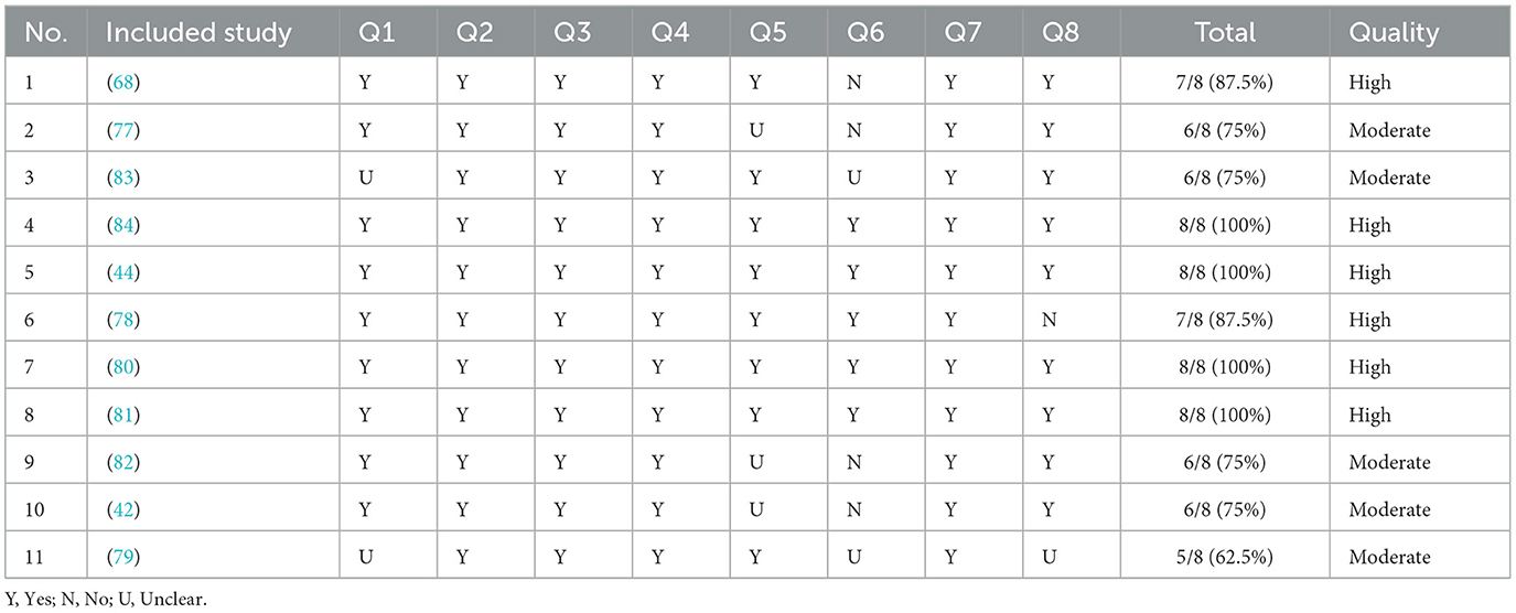 We used the JBI checklist to evaluate the risk of bias in included studies (Table 2). The risk of bias assessment comprised eight questions (58). Two reviewers independently assessed each study, with disagreements resolved through discussion. Detailed risks of bias assessments for individual studies are summarized in Table 3. The assessment revealed that all 11 included studies demonstrated high and moderate quality. The main source of bias was related to confounding factor management. Six studies failed to clearly identify potential confounders or implement appropriate statistical adjustment strategies.