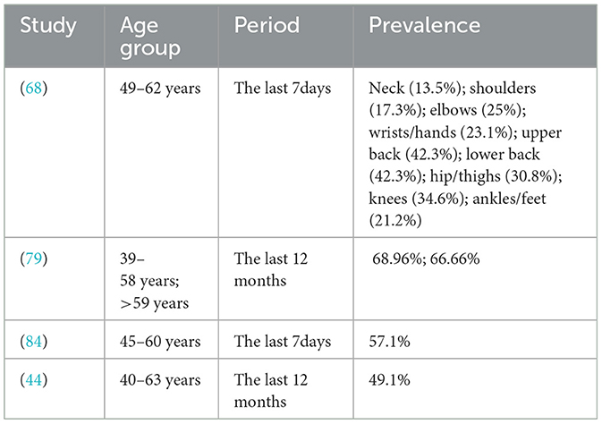 Due to substantial heterogeneity among study participants, a meta-analysis was not feasible; therefore, a descriptive analysis was employed to synthesize the results. All 11 articles included hospital cleaners aged 50 years and above. Among these, six studies provided age-stratified data (44, 68, 79, 81, 82, 84), of which four studies reported prevalence rates (Table 3). Results from the four studies with age-stratified data showed that older hospital cleaners (aged 39–62 years across studies) had overall MSD prevalence rates ranging from 49.1% to 68.96%. Prevalence rates varied across different body regions, with the upper back and lower back showing the highest prevalence rates, both reaching 42.3%. Importantly, different studies employed varying time windows (7 days vs. 12 months), which may affect prevalence comparisons. The 12-month prevalence was generally higher than the 7-day prevalence, which is consistent with the chronic and recurrent nature of MSDs in this population.