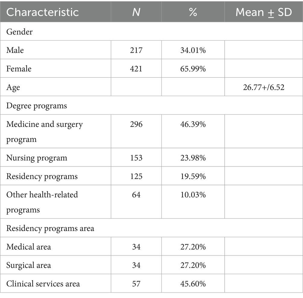 A total of 638 participants were included in the study (Table 1). The mean age was 26.77 ± 6.52 years, and 65.99% (n = 421) were female. Nearly half were enrolled in the medicine and surgery program (46.39%; n = 296), followed by nursing (23.98%; n = 153), residency programs (19.59%; n = 125), and other health-related programs (10.03%; n = 64). Among residents, 27.2% (n = 34) were in medical specialties, 27.2% (n = 34) in surgical specialties, and 45.6% (n = 57) in clinical services.