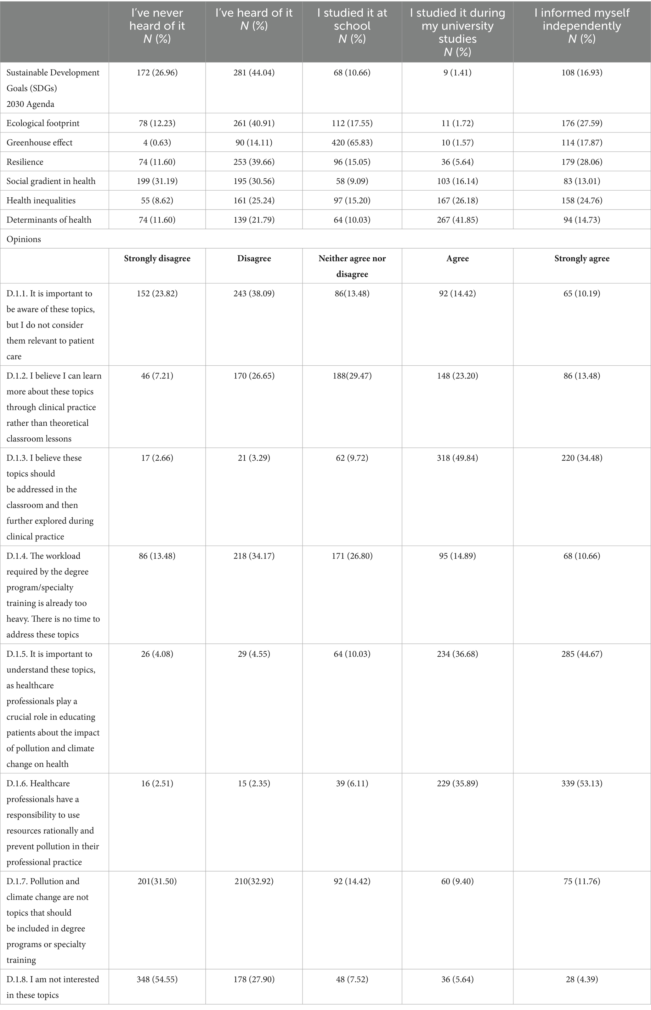 Most participants supported the inclusion of sustainability topics in medical education: 84.32% agreed these subjects should be taught both in the classroom and reinforced during clinical practice, 81.35% emphasized the educational role of healthcare professionals toward patients, and 89.02% recognized pollution prevention as part of professional responsibility. Only 10.03% expressed disinterest or viewed these topics as irrelevant to patient care.