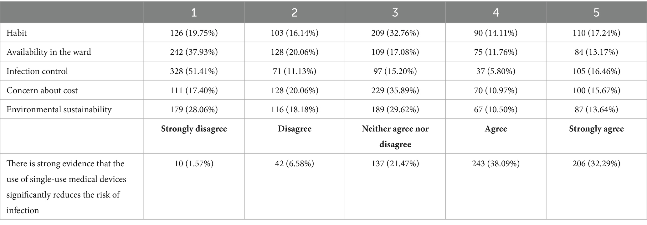 Preferences regarding single-use versus reusable medical devices are summarized in Table 3. About 27.27% preferred reusable devices, 27.74% favored single-use devices, and 22.57% had no preference. Among the factors influencing this choice, 51.41% cited infection control as highly important, 37.93% mentioned availability in the department, 35.89% considered cost moderately relevant, and environmental sustainability was rated as very influential by 28.06% and moderately influential by 29.62% of respondents. In addition, 70.38% agreed that single-use devices reduce the risk of infection.