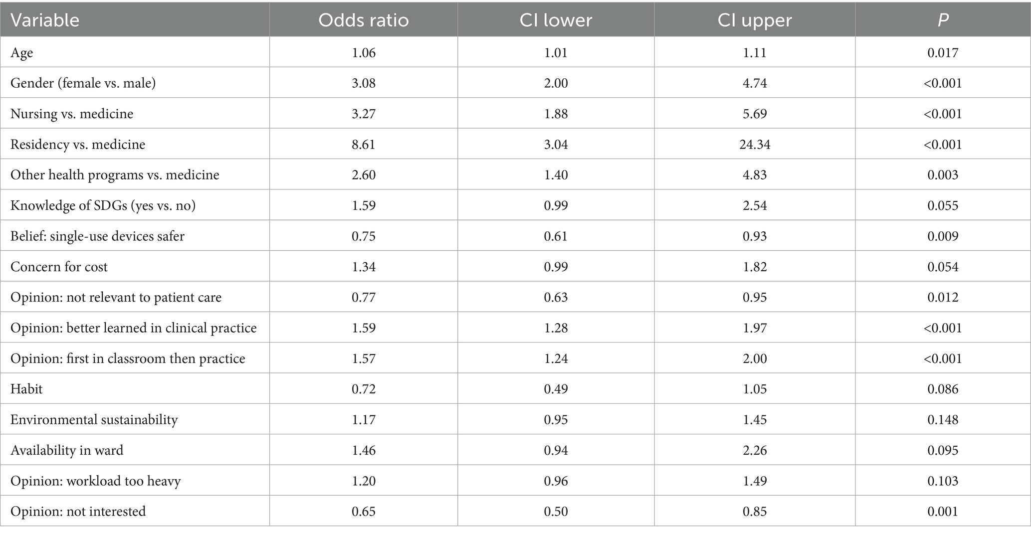 Attitudes toward curricular content were also highly predictive. Agreement with the integration of sustainability topics in both classroom and clinical settings was associated with greater knowledge and positive attitudes, echoing literature that emphasizes the value of curricular continuity from theoretical to practical learning environments (17, 18). Notably, students who believed that pollution and climate change are relevant to patient care were more engaged, whereas those who viewed these topics as marginal to clinical work were less knowledgeable. This highlights the need to communicate the clinical implications of climate change, such as the rise in noncommunicable diseases, vector-borne illnesses, and mental health effects linked to environmental stressors (19, 20). Experiential learning also emerged as a critical component. Students who expressed a preference for learning sustainability topics through clinical experience had higher odds of both knowledge and positive attitudes. This supports pedagogical models that embed environmental literacy into real-world clinical rotations and interprofessional teamwork (21, 22). The World Health Organization has similarly called for capacity-building approaches that strengthen climate resilience and promote environmentally sustainable healthcare systems (23). In addition to educational variables, perceptions of responsibility were significant. Students who believed healthcare professionals have a duty to use resources responsibly and prevent pollution were more likely to be knowledgeable, underscoring the ethical dimension of sustainability in medicine. This aligns with the Lancet Commission’s call for clinicians to lead climate action by modeling environmentally responsible behavior and advocating for systemic change (24). However, persistent barriers remain. A substantial number of students cited curricular overload and limited training as obstacles to addressing sustainability. These findings echo international reports that medical curricula still lack comprehensive climate-health education, despite growing consensus on its importance (25, 26). Furthermore, misconceptions about single-use medical devices—such as the belief that they are inherently safer—continue to undermine sustainability efforts and suggest the need for clearer evidence-based guidance on safe and sustainable practices (27).