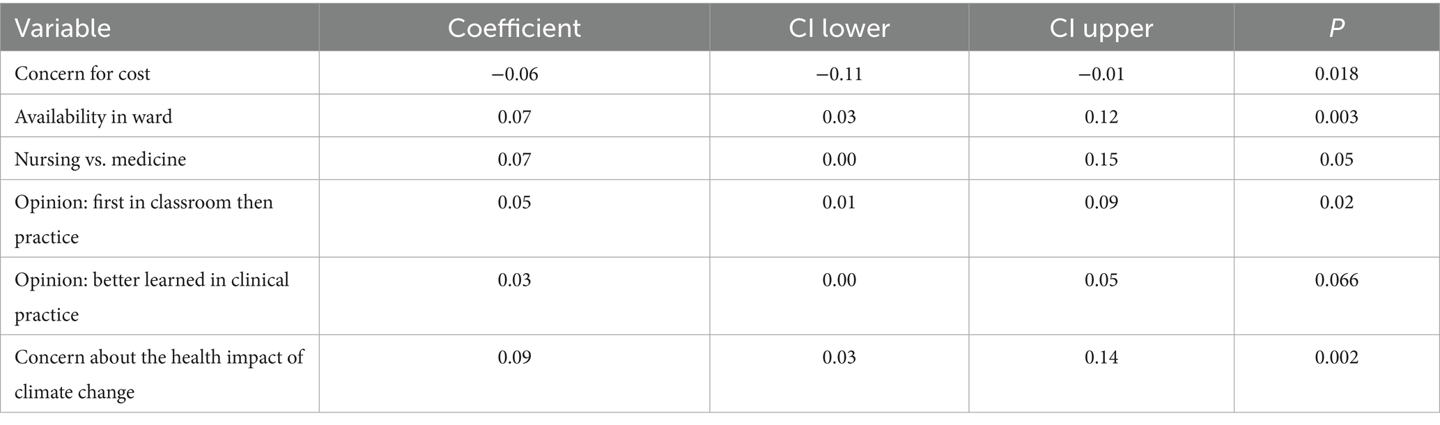 In contrast, the Poisson regression model on the knowledge score highlighted different dynamics. While demographic differences were less pronounced, attitudes toward learning approaches and values related to sustainability emerged as key predictors. Students who emphasized environmental sustainability when considering medical device use or who supported introducing topics first in the classroom and then reinforcing them in practice demonstrated significantly higher knowledge scores. Moreover, concern about climate change was itself a strong predictor of knowledge, suggesting a reciprocal relationship between awareness and understanding. Although the explanatory power of this model was modest, the consistency of attitudinal predictors across both outcomes reinforces the notion that beliefs about the clinical relevance of sustainability are as influential as formal education (18).