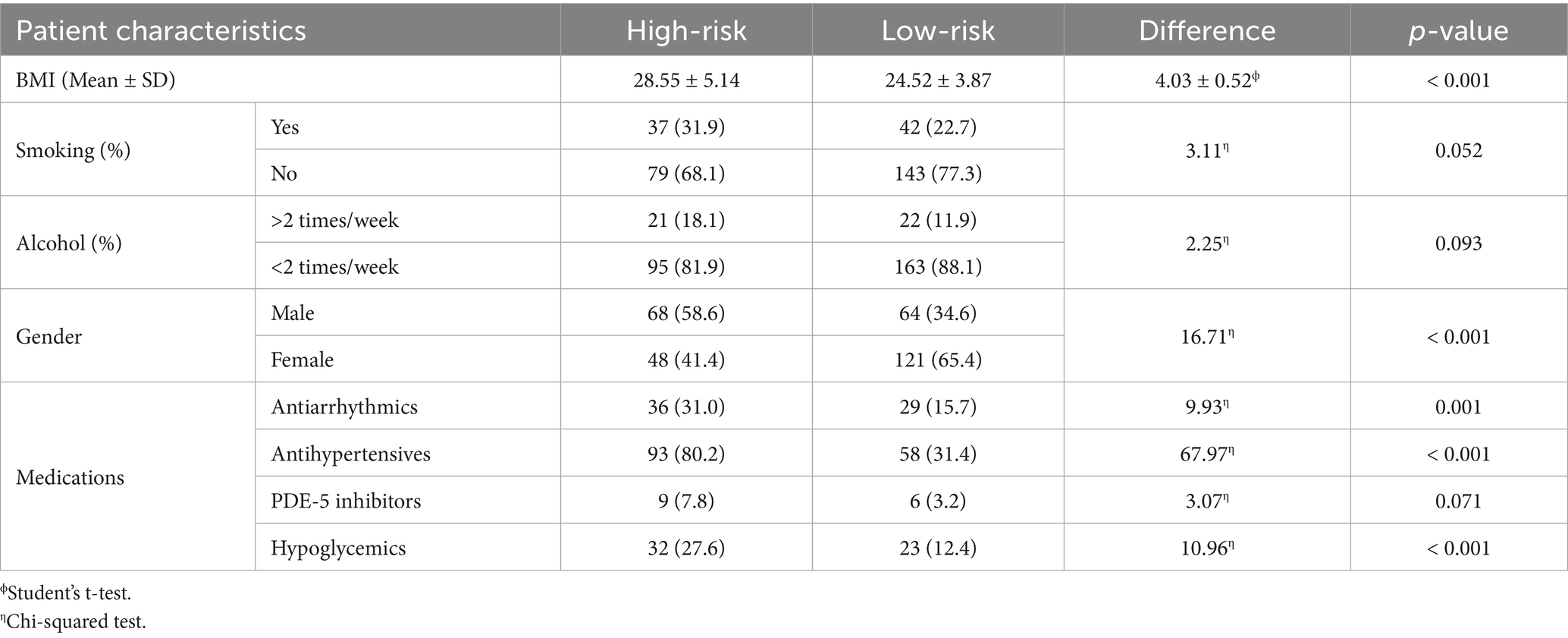 As for medication use, 151 participants (50.17%) were taking antihypertensive medications, 15 (4.98%) were using phosphodiesterase-5 (PDE5) inhibitors, 65 (21.59%) were on antiarrhythmic medications, and 55 (18.27%) were receiving antidiabetic treatment.
