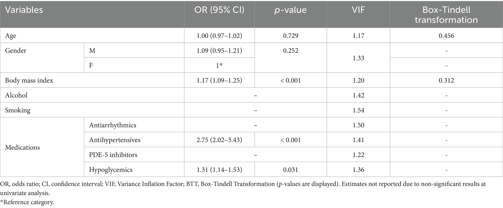 In our sample, 51.8% (n = 156/301) scored positively to category #1, whereas 24.3% (n = 73/301) and 48.8% (n = 147/301) to categories #2 and #3, respectively. Overall, 38.5% (n = 116/301) were classified as being high-risk, whereas 61.5% (n = 185/301) were low-risk. Table 2 reports general characteristics and medications based on risk categories. High-risk patients had a significantly higher BMI compared to low-risk (high-risk: 28.55 ± 5.14, low-risk: 24.52 ± 3.87; mean difference: 4.03 ± 0.52, p-value < 0.001). No differences were observed between smoking and drinking, although a higher proportion of high-risk patients declared these habits and p-values were proximal to significance threshold (smoking: p-value = 0.052; alcohol: p-value = 0.093). A significant difference was observed between gender prevalence, as most high-risk patients were males (in high-risk, males: n = 68/116, females: n = 48/116; p-value < 0.001). Concerning medications, a significantly higher proportion of high-risk patients was found to be taking antiarrhythmic (high-risk: 36/116, low-risk: 29/185, p-value: 0.001), antihypertensive (high-risk: 93/116, low-risk: 58/185, p-value: < 0.001) and hypoglycemic medications (high-risk: 32/116, low-risk: 23/185, p-value: < 0.001). No significant difference was observed for PDE-5 inhibitors, although a higher proportion of at-risk patients was taking medication (high-risk: 9/116, low-risk: 6/185, p-value = 0.071; Table 2). At univariate logistic regression analysis, age (OR = 1.03, 95%CI: 1.02–1.05, p-value < 0.001), male gender (OR = 1.37, 95%CI: 1.23–1.60, p-value < 0.001), and BMI (OR = 1.23, 95%CI: 1.16–1.31, p-value < 0.001) were significantly related to patients with poor BQ outcomes. Similarly, those at-risk were more likely to be under antihypertensive (OR = 7.71, 95%CI: 4.35–9.32), p-value < 0.001) and diabetes medications (OR = 2.18, 95%CI: 1.28–3.92, p-value = 0.024). There were no significant associations between BQ outcomes and assumption of antiarrhythmics (OR = 1.56, 95%CI: 0.32–2.88, p-value = 0.133) and PDE-5 inhibitors (OR = 2.51, 95%CI: 0.87–7.25, p-value = 0.089; Supplementary Content 2). At multivariate logistic regression analysis, BMI (OR = 1.17, 95%CI: 1.09–1.25, p-value < 0.001), as well as antihypertensive (OR = 2.75, 95%CI: 2.02–3.43, p-value < 0.001) and diabetes (OR = 1.31, 95%CI: 1.14–1.53, p-value = 0.031) medication use were significantly associated with high-risk. Results of the univariate and multivariate regression analyses are presented in Table 3.
