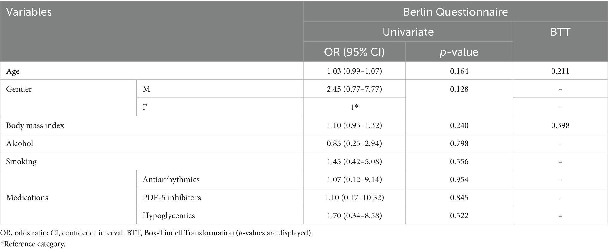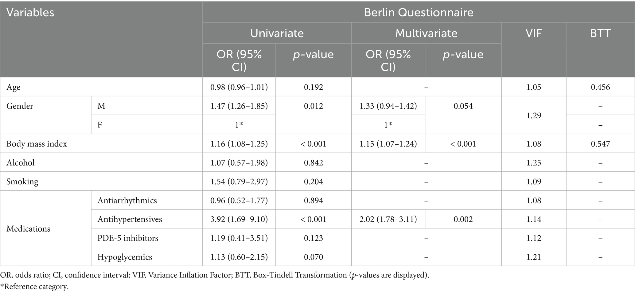 A sensitivity analysis was performed excluding 119 patients (females = 74/119, 62.18%; mean age = 54.48 ± 13.23) who were referring to the pharmacies for sleep-related breathing concerns or seeking advice for insomnia. Results are presented in Table 4. At univariate analysis, significant associations were found with BMI (OR = 1.16, 95%CI: 1.06–1.25, p-value < 0.001), male gender (OR = 1.47, 95%CI: 1.26–1.85, p-value = 0.012) and antihypertensive drugs assumption (OR = 3.92, 95%CI: 1.69–9.10, p-value = 0.001). Multivariate logistic regression confirmed significant associations with BMI (OR = 1.15, 95%CI: 1.07–1.24, p-value < 0.001) and antihypertensive medications use (OR = 2.02, 95%CI: 1.78–3.11, p-value = 0.002). Multicollinearity checks showed low impact of each variable in the regression models overall (VIF < 3). A further sensitivity analysis was performed excluding 164 patients (females = 79/164, 48.2%; mean age = 62.48 ± 11.73 years) with known hypertension or adiposity (i.e., BMI > 30). In this subset, the relative prevalence of individuals at-risk for OSA was significantly reduced compared to the overall population (n = 13/137, 9.5%, p-value < 0.001). Moreover, no additional associations between individual variables and poor BQ outcomes were observed at univariate analysis (Table 5). The assumption of linearity for continuous variables was confirmed in all regression models (p-value > 0.05; Tables 3–5).