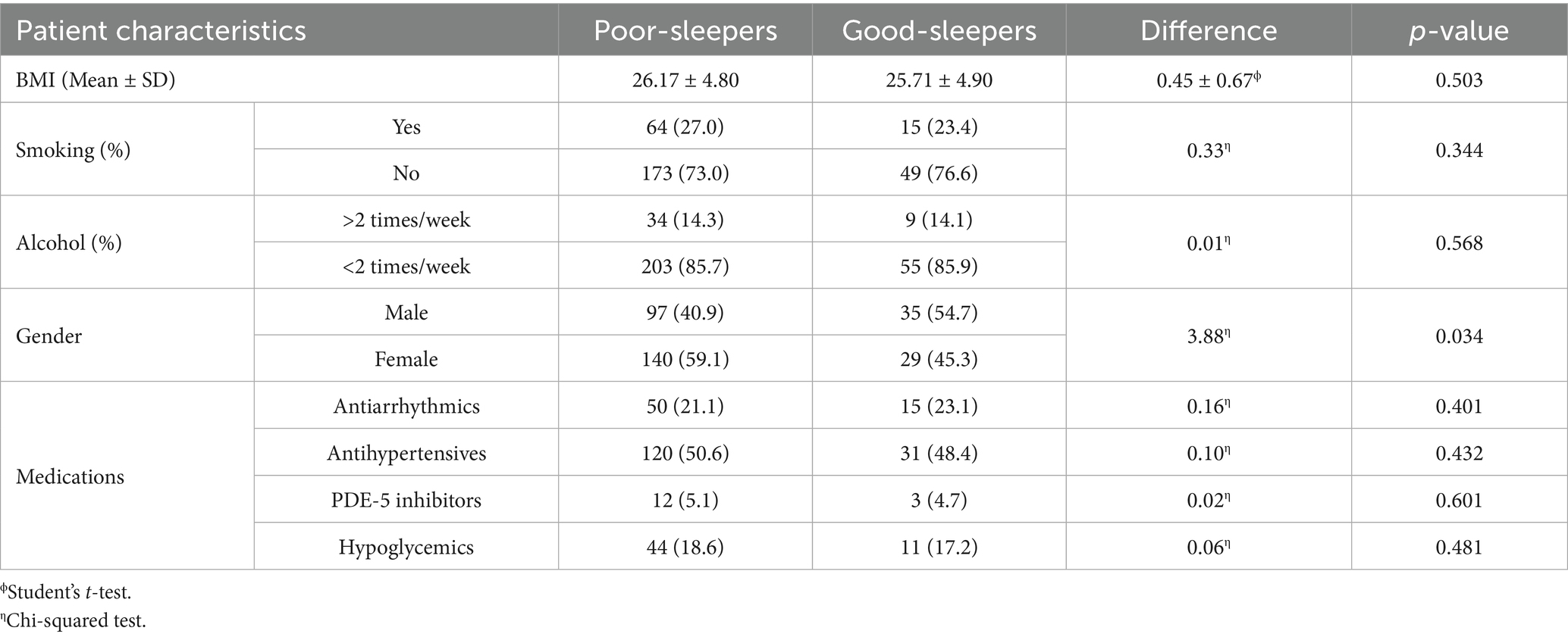 The mean score of each sleep-related subdomain is reported in Table 6. Overall, the mean PSQI derived by the sum of single sleep-domains was 8.57 ± 3.6. This was significantly higher than the mean reported PSQI scores in the healthy Italian population (15) (mean difference 4.57, CI95%: 4.16–4.98, p-value < 0.001). Out of the whole sample, 237 patients (n = 237/301, 78.7%) scored > 5 and were hence classified as having poor sleep quality. Sixty-four patients (n = 64/301, 21.3%) scored ≤ 5 and were defined high-quality sleepers. Patient characteristics according to PSQI outcomes are reported in Table 7. We observed fewer statistically significant differences in general characteristics between patients who were defined poor- or high-quality sleepers according to the PSQI (BMI: mean difference = 0.45 ± 0.67, p-value = 0.503; smoking: p-value = 0.344; alcohol: p-value = 0.568). Similarly, no significant differences were observed between the assumption of specific medications and PSQI scores (antiarrhythmics: p-value: 0.401; antihypertensives: p-value = 0.432; PDE-5 inhibitors: p-value = 0.601; hypoglycemics: p-value = 0.481). The relative risk of poor-sleeping according to PSQI outcomes was not associated with baseline demographic characteristics (age: OR = 0.99, 95%CI = 0.97–1.01, p-value = 0.237; male gender: OR = 0.68, CI: 0.33–1.02, p-value = 0.052; BMI: OR = 1.02, 95%CI = 0.96–1.08, p-value = 0.502) nor dependent on the specific medication taken by patients (antiarrhythmics: OR = 0.87, 95%CI = 0.35–1.68, p-value: 0.687; antihypertensives: OR = 1.09, 95%CI = 0.63–1.89, p-value = 0.755; PDE-5 inhibitors: OR = 1.08, 95%CI = 0.30–3.97, p-value = 0.902; hypoglycemics: OR = 1.10, 95%CI = 0.53–2.27, p-value = 0.800; Supplementary Content 2). The assumption of linearity of the logit was confirmed for both BMI (p-value = 0.394) and age (p-value = 0.121). Notably, there was a statistically significant higher prevalence of females among poor-sleepers (in poor-sleepers, males: n = 97/237, 40.9%, females: n = 140/237, 59.1%; p-value: 0.034).
