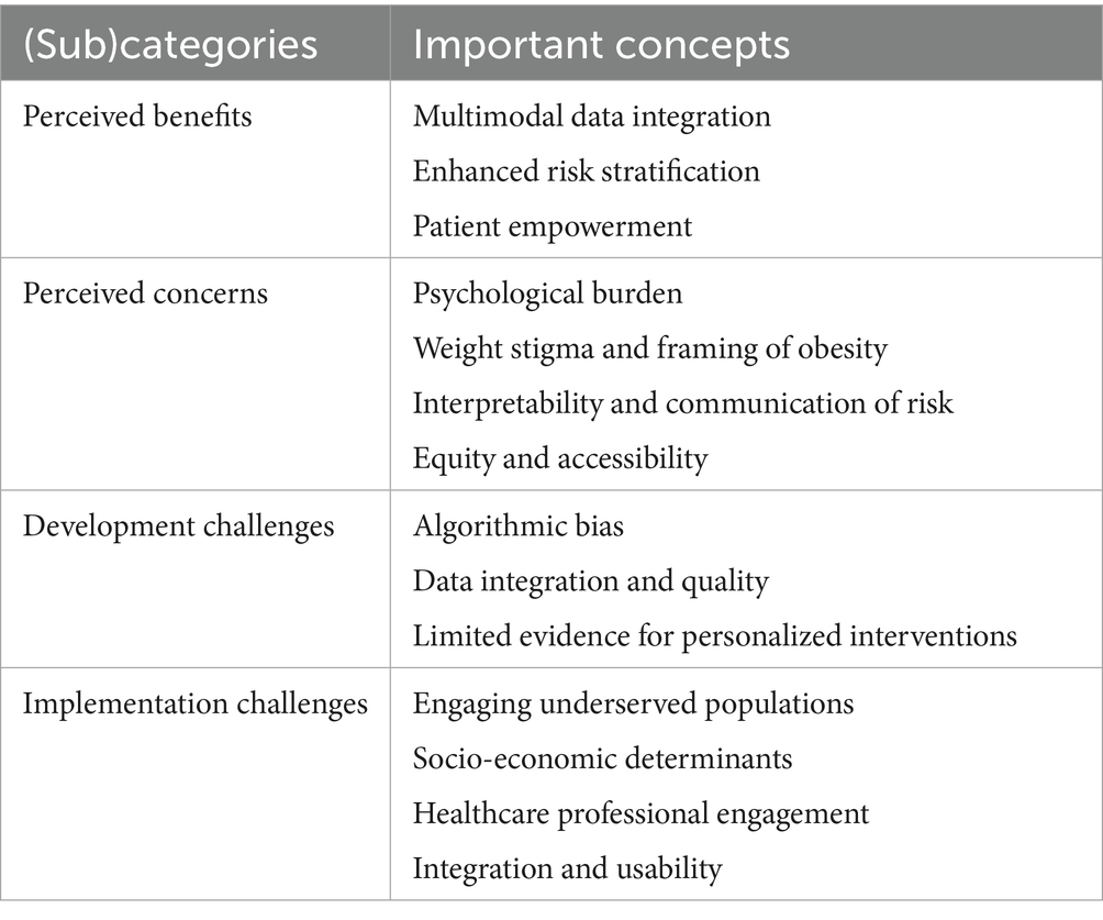 Our findings offer important insights for the refinement and responsible implementation of the AI-POD tools in clinical practice. Critical considerations include enhancing predictive performance while preserving model explainability, reducing user burden, designing effective risk communication strategies, addressing disparities in digital access and health literacy, and ensuring seamless integration within existing healthcare systems, aligning with the TAM model (19). Future research should focus on developing tailored communication approaches for individuals living with obesity and identifying strategies to promote sustained engagement with AI-based health interventions. Finally, our findings underscore the importance of embedding co-creation as a formal requirement within EU policy on AI and health innovation. Early and continuous stakeholder involvement allows potential challenges to be identified and mitigated in advance, improving user alignment and cost-efficiency. By ensuring that technologies are designed with and for end users, such policies would enhance the likelihood of successful implementation, adoption, and equitable benefit realization across European healthcare systems.