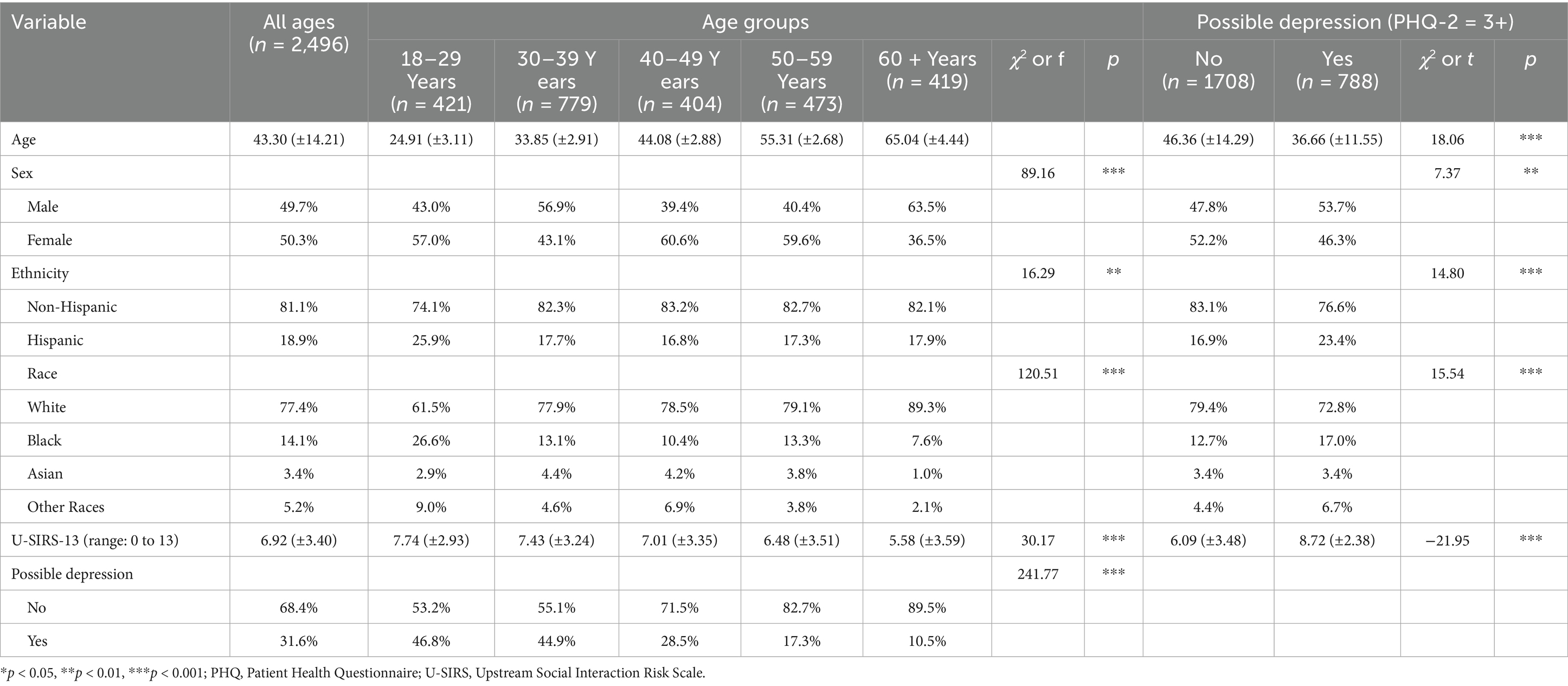 Table 1 reports sample characteristics stratified by age group and possible depression (PHQ-2 score ≥3). Ages ranged from 18 to 89 years. On average (±SD), participants were aged 43.30 (±14.21) years, with 16.9% being ages 18–29 years, 31.2% ages 30–39 years, 16.2% ages 40–49 years, 19.0% ages 50–59 years, and 16.9% ages 60 years and older. About half of the sample (50.3%) was female, and 81.1% identified as non-Hispanic. About 77.4% of participants identified as White, 14.1% were Black, 3.4% were Asian, and 5.2% another race or multiple races. A total of 31.6% participants had possible depression. On average, participants reported a U-SIRS-13 score of 6.92 (±3.40) on a scale from 0 to 13.