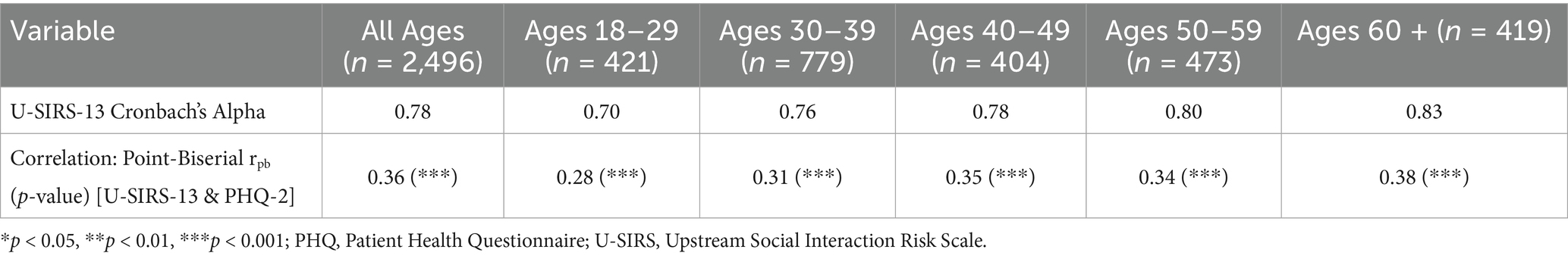 All analyses were performed using the IBM SPSS version 29. Descriptive statistics were calculated for all variables of interest, which were initially compared by participant age group and PHQ-2 score ≥3. When comparing across age groups, chi-square tests were used for categorical variables and one-way ANOVA were used for continuous variables. When comparing across PHQ-2 score ≥3, chi-square tests were used for categorical variables and two-tailed independent sample t-tests were used for continuous variables. Cronbach’s alpha coefficients were calculated to identify the reliability of the U-SIRS-13 for the total sample and each age group. Point-biserial correlation coefficients were calculated to identify the strength and direction of relationships between U-SIRS-13 (continuous) and PHQ-2 score ≥3 (dichotomous) for the total sample and each age group. Then, a series of logistic regression models were fitted to assess the associations of U-SIRS-13 and covariates (i.e., age, sex, ethnicity, and race) on PHQ-2 score ≥3 for all participants, then separately within each age group. For each model, PHQ-2 score <3 served as the referent category with statistical significance set at p < 0.05. Collinearity statistics were calculated (i.e., Variance Inflation Factor (VIF) and tolerance), which indicated no multicollinearity among independent variables. To account for multiple analyses and reduce risks for Type I errors, a Benjamini Hochberg False Detection Rate of 95% was used (34). All significant findings met these criteria.