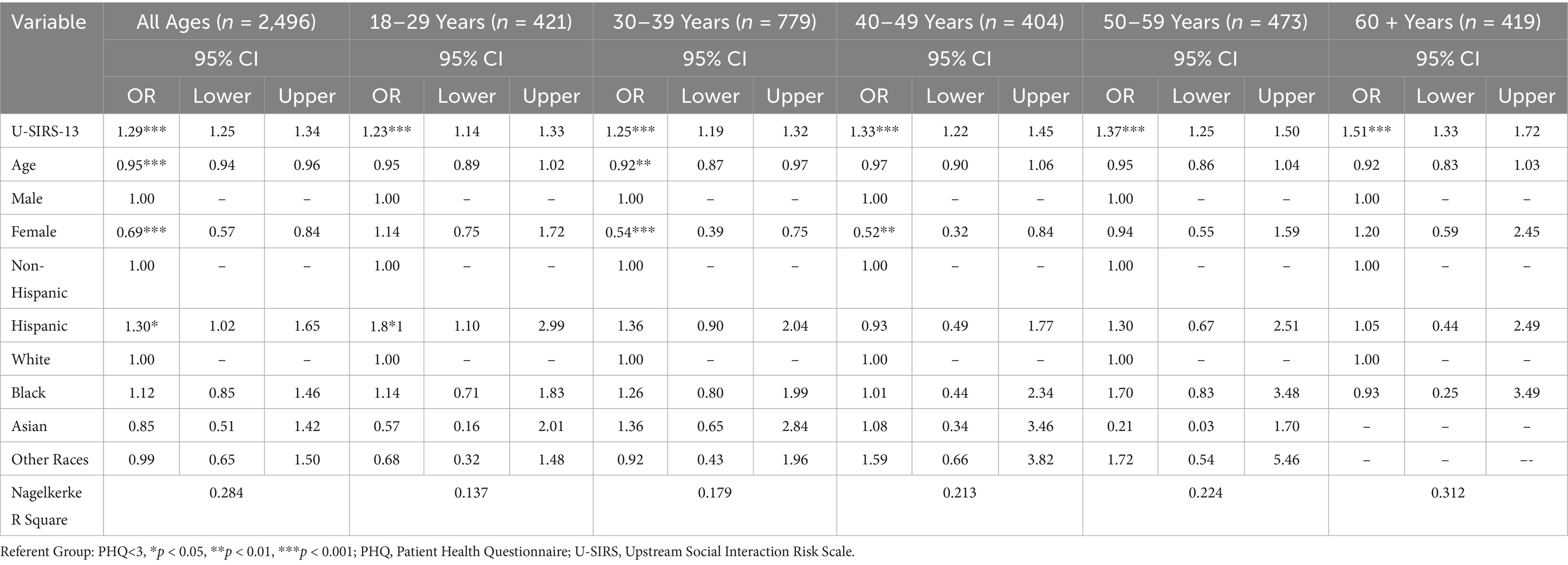 Methods: Participants completed Upstream Social Interaction Risk Scale (U-SIRS-13) and the Patient Health Questionnaire short version (PHQ-2). Within each of five age groups (18–29, 30–39, 40–49, 50–59, 60+), descriptive statistics and Pearson’s r correlations were calculated for U-SIRS-13 and PHQ-2. Subsequently, logistic regression models were fitted to assess the relationship between the U-SIRS-13 and PHQ-2 (a score of 3 or greater indicated possible depression), controlling for sociodemographic covariates.