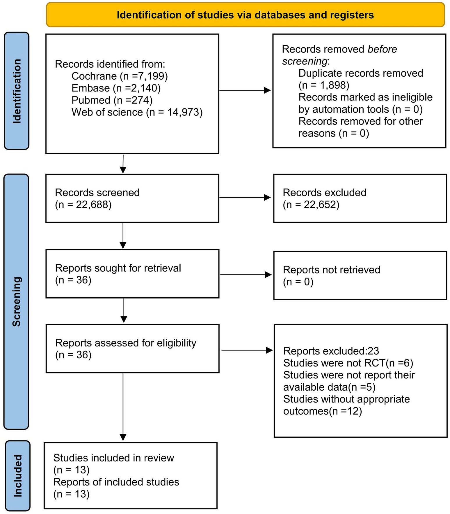 The quality of individual studies and the overall study quality are illustrated in Supplementary Figures 1, 2, respectively. All 13 trials demonstrated adequate random sequence generation, with 6 randomized controlled trials revealing their methods of allocation concealment. While all randomized controlled trials exhibited uncertainties regarding performance bias, 1 trial was identified as having a high risk of performance bias, and 5 trials were found to have a high risk of detection bias. Furthermore, 9 studies indicated a low risk of attrition bias. Among the remaining bias categories, 7 trials were assessed as having a low risk of bias.