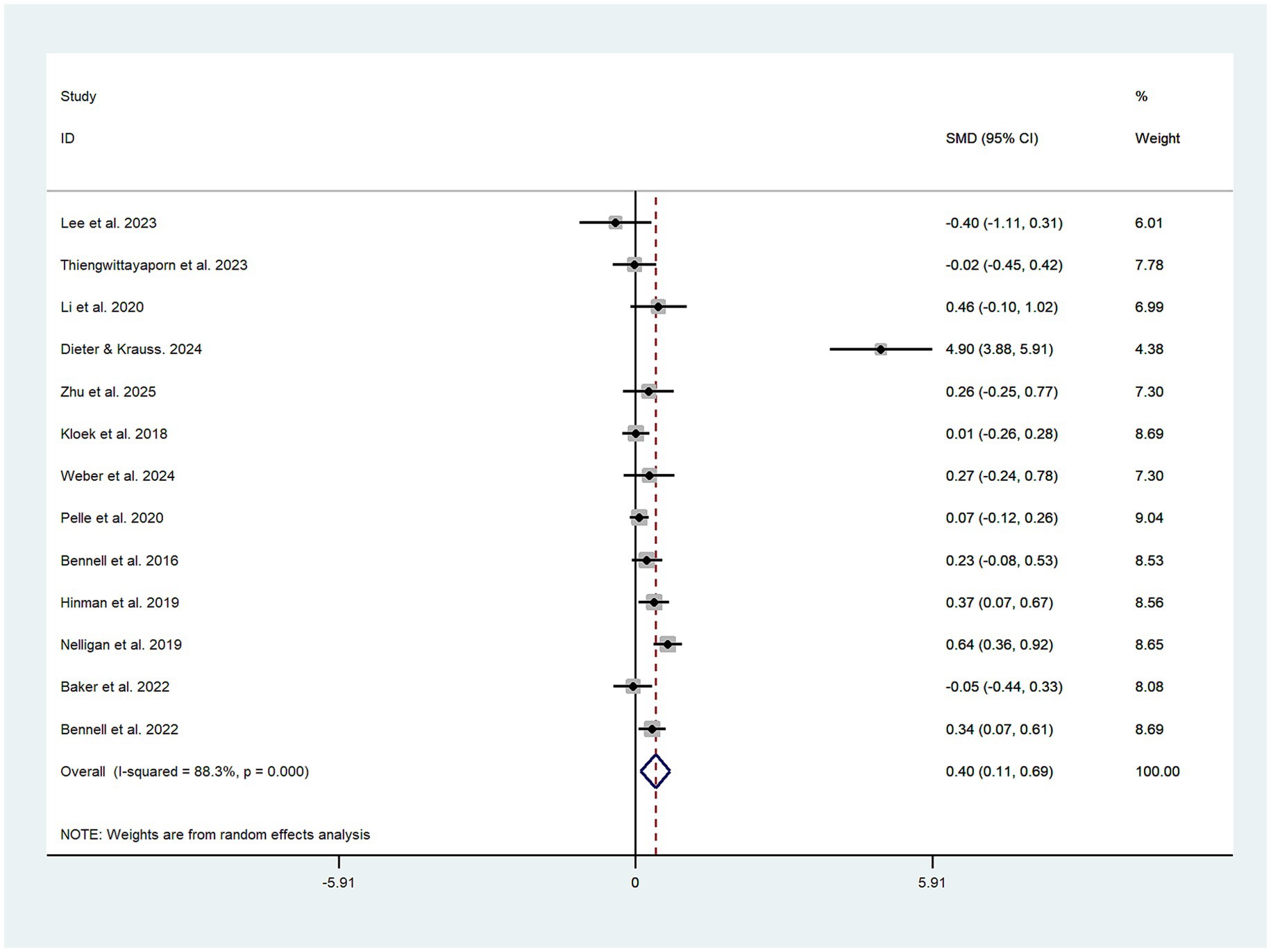 All 13 trials investigated the impact of exercise interventions delivered via telemedicine on pain in older adult patients with OA, comprising a telerehabilitation group (932 cases) and a control group (913 cases). The results indicated that exercise interventions provided through telemedicine were more effective than those in the control group, demonstrating a statistically significant SMD of 0.40 (SMD = 0.40, 95% CI: 0.11 to 0.69, I2 = 88.3% following heterogeneity adjustment, Pheterogeneity < 0.1; see Figure 2). Based on the GRADE evaluation, the level of quality of evidence was moderate (see Supplementary Figure 3). The funnel plot is symmetrically distributed (see Figure 3), suggesting no potential publication bias (Pegger = 0.14).