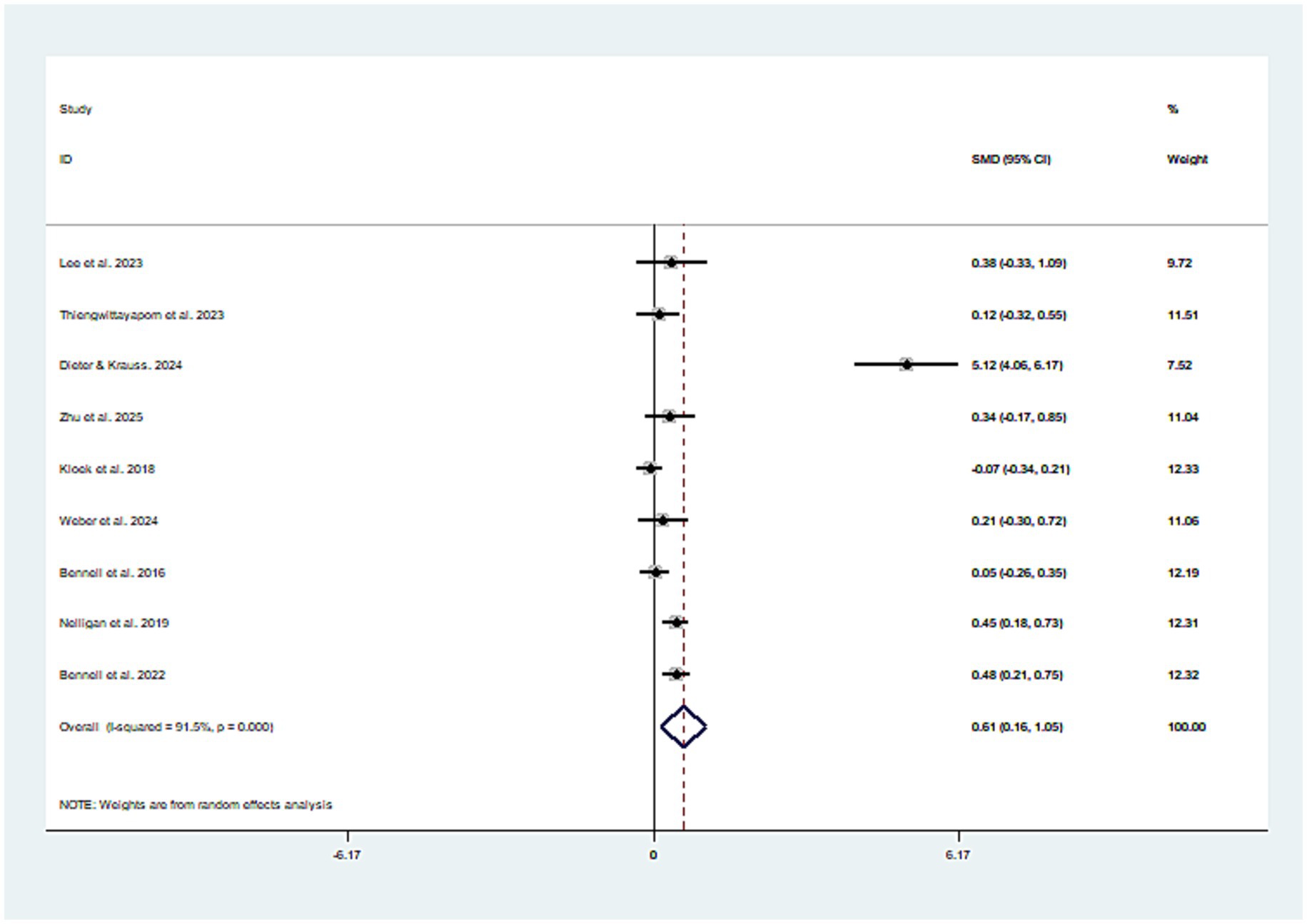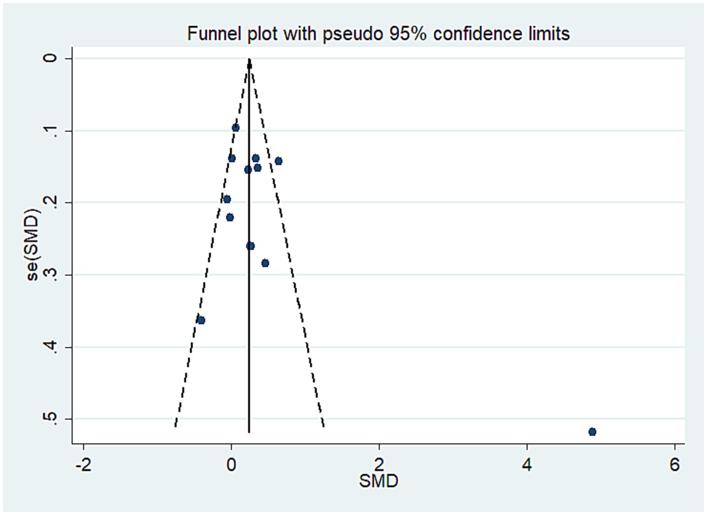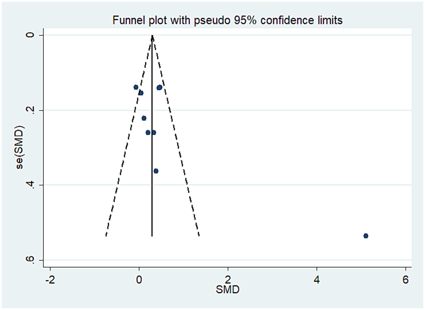 Nine studies investigated the impact of mobile health technology-based exercise on physical function, involving a total of 1,088 participants. The results showed that participants in the mobile health exercise group had significantly improved physical function compared to the control group (SMD = 0.61, 95% CI: 0.16 to 1.05, I2 = 91.5%) (Figure 4). Additionally, the asymmetry in the funnel plot of dysfunction data indicated the absence of publication bias (Pegger = 0.09; see Figure 5).