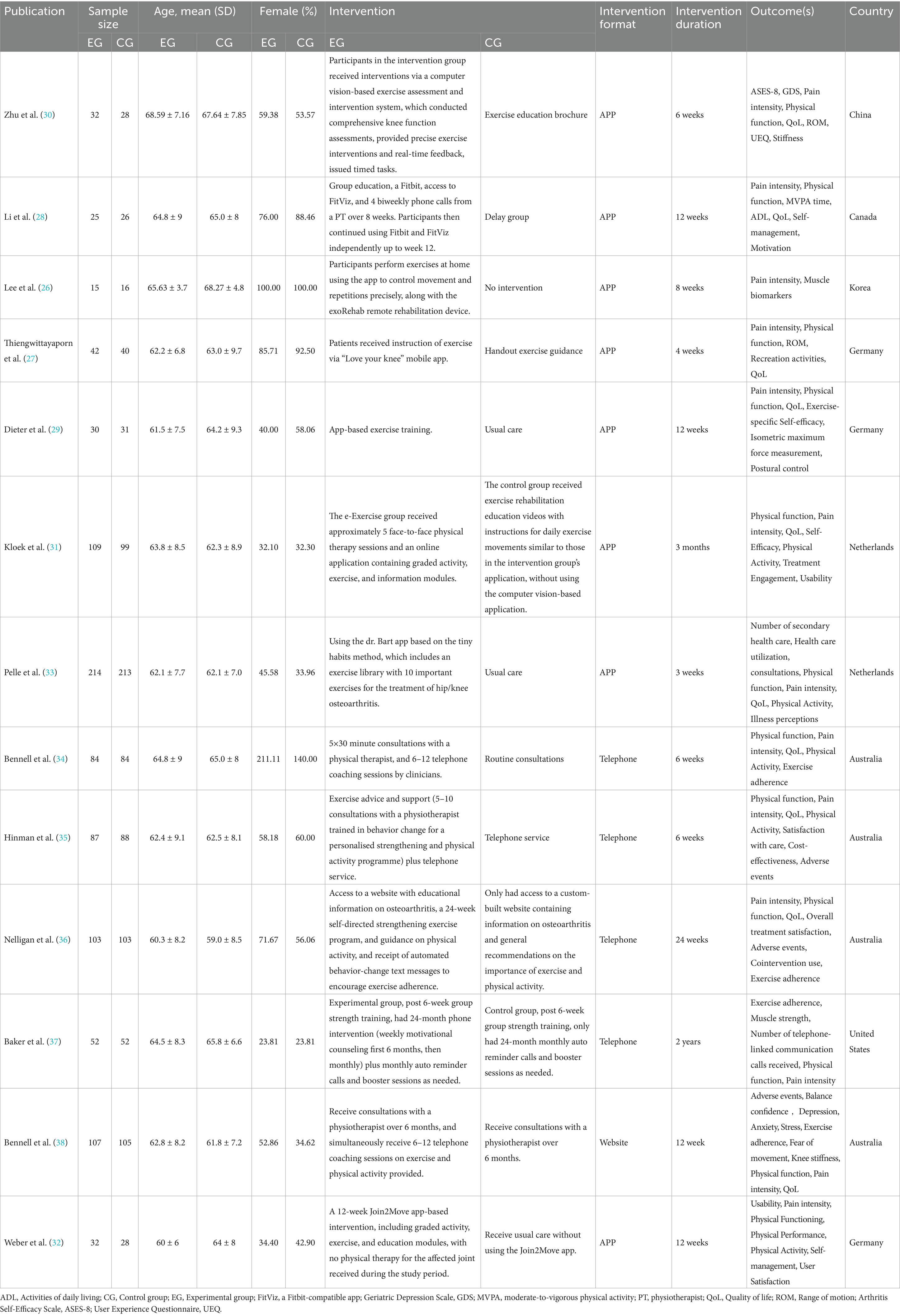 An initial literature search yielded 24,586 records. After the removal of 1,898 duplicate entries, 22,688 articles proceeded to the title and abstract screening phase, with only 36 articles advancing to further evaluation. Ultimately, 13 papers met the established research criteria (26–38). To ensure that potentially relevant studies were not overlooked, we also reviewed the reference lists of similar meta-analyses and reviews. The article selection process is illustrated in the PRISMA flow diagram presented in Figure 1. The search retrieved 13 trials published between 2016 and 2025. The telerehabilitation intervention group comprised 932 participants, while the control group included 913 participants. All study subjects were required to meet the criteria of having an average age over 60 and being diagnosed with OA. The intervention period varied from 4 weeks to 2 years. Table 1 summarizes the characteristics of the included studies and their participants.