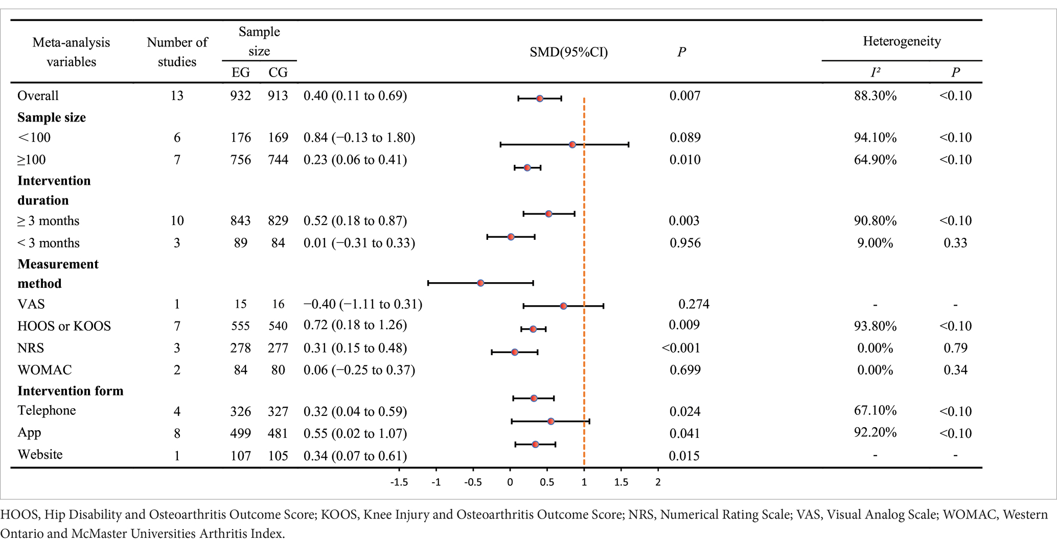 Based on the primary outcome of pain, subgroup analyses were conducted considering various factors of interest. In the subgroup analysis focused on intervention duration, a total of 13 articles were included (see Table 2). Among these, 10 studies reported an intervention duration of 3 months or longer, while 3 studies had an intervention duration of less than 3 months. The analysis revealed that studies with an intervention duration of 3 months or more (SMD = 0.52, 95% CI: 0.18 to 0.87) demonstrated significantly greater pain improvement compared to those with an intervention duration of less than 3 months (SMD = 0.01, 95% CI: −0.31 to 0.33). Additionally, studies with a sample size of 100 or more (SMD = 0.23, 95% CI: 0.06 to 0.41) also exhibited significantly greater pain improvement compared to studies with a sample size of less than 100 (SMD = 0.84, 95% CI: −0.13 to 1.80). Furthermore, we conducted a subgroup analysis based on the form of intervention. The results indicated that exercise interventions, whether conducted via mobile phone (SMD = 0.32, 95% CI: 0.04 to 0.59), web (SMD = 0.34, 95% CI: 0.07 to 0.61), or app (SMD = 0.55, 95% CI: 0.02 to 1.07), were effective in reducing pain among older adult individuals with OA. Besides, Additionally, when conducting subgroup analyses on intervention duration and measurement methods, we found they explained the high heterogeneity in the study results. Studies with intervention durations exceeding three months showed higher heterogeneity (I2 = 90.80%), while those with durations under three months exhibited lower heterogeneity (I2 = 9%). Studies using HOOS or KOOS scales demonstrated higher heterogeneity (I2 = 93.80%), whereas those employing other assessment scales consistently showed lower heterogeneity.