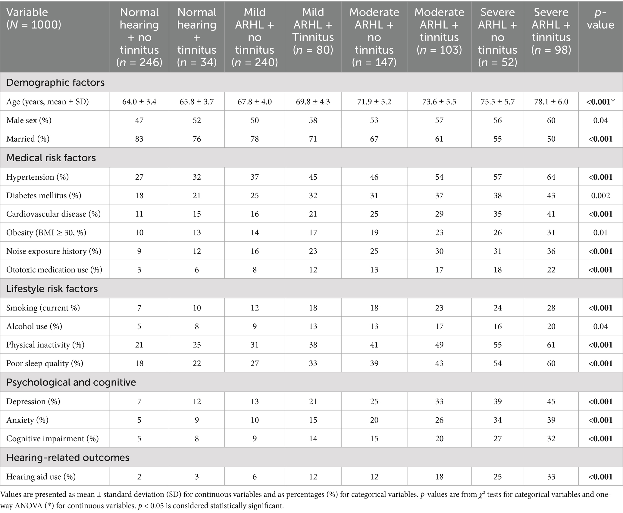 This 1,000-person study found substantial differences in age, sex, marital status, medical comorbidities, lifestyle choices, and psychological factors in connection to age-related hearing loss (ARHL)/deafness and tinnitus severity (Table 1). The trend was clear across all categories. Participants with severe ARHL and tinnitus were significantly older (78.1 ± 6.0 years) compared to those with normal hearing and no tinnitus (64.0 ± 3.4 years, p < 0.001). The severe ARHL with tinnitus group had 60% male sex (p = 0.04). Marital status dropped sequentially with worsening ARHL and tinnitus, from 83% in normal hearing to 50% in severe ARHL (p < 0.001). ARHL and tinnitus groups consistently had more chronic diseases. Hypertension, diabetes (type 1 and type 2), and cardiovascular disease were most common in severe ARHL with tinnitus (64, 43, and 41%, respectively), about two-to-fourfold higher than normal hearing controls. Obesity, noise exposure, and ototoxic drug use substantially increased with hearing loss severity (p < 0.01). All lifestyle risk variables (smoking, alcohol use, physical inactivity, and poor sleep quality) were considerably higher (p < 0.05) in severe ARHL with tinnitus compared to normal hearing. ARHL and tinnitus worsened cognitive and psychological issues. Depression increased from 7 to 45% in severe ARHL with tinnitus, whereas anxiety and cognitive impairment increased to 39 and 32%, respectively (p < 0.001). Hearing aid use was low overall but significantly increased with severity (2% in normal hearing vs. 33% in severe ARHL with tinnitus, p < 0.001), indicating underutilization despite necessity.