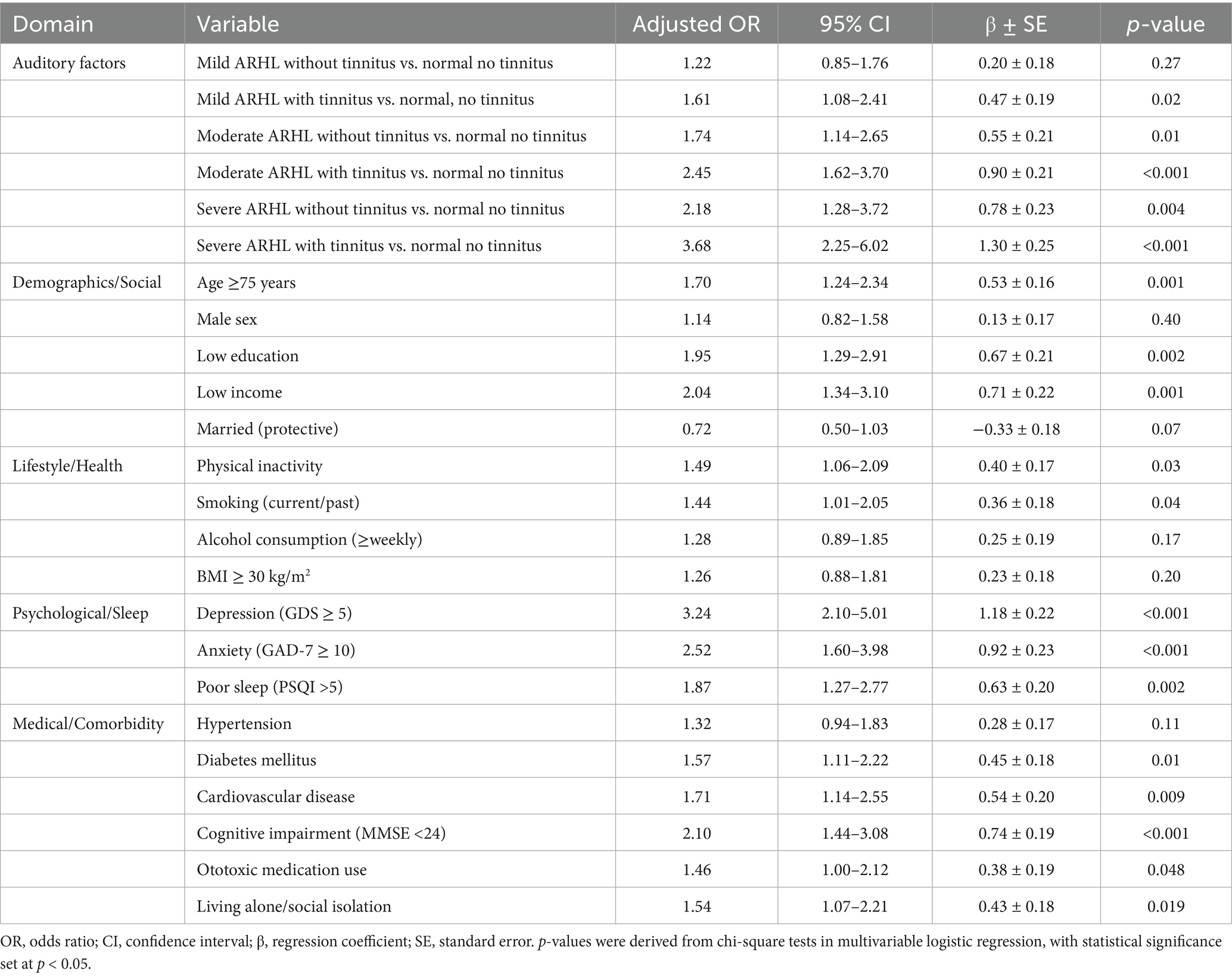 The association between age-related hearing loss, tinnitus, and comorbid factors plays a crucial role in determining the quality of life among older adults. Table 2, reveals adjusted ARHL, tinnitus severity, and QoL relationships. The hearing status gradient was strong. Mild ARHL with tinnitus was more likely to have poorer QoL than normal hearing without it (OR = 1.61, 95% CI: 1.08–2.41, p = 0.02), whereas moderate and severe ARHL had greater odds (OR = 1.74 and 2.18, respectively). ARHL with tinnitus conferred the highest risk, with an OR of 3.68 (95% CI: 2.25–6.02, p < 0.001) in severe cases. Sociodemographic and economic factors affected QoL. Age ≥75 years had approximately twice the risk of poor QoL (OR = 1.70, 95% CI: 1.24–2.34, β = 0.53, SE = 0.16, p = 0.001), with low education and income further increasing the risk (OR = 1.95 and 2.04, respectively). Marriage provided some protection (OR = 0.72, p = 0.07). Adverse lifestyle and health behaviors also decreased QoL. Although alcohol use (OR = 1.28, 95% CI: 0.89–1.85, p = 0.17) and obesity (OR = 1.26, 95% CI: 0.88–1.81, p = 0.20) were not statistically significant, both smoking (OR = 1.44, 95% CI: 1.01–2.05, β = 0.36, SE = 0.18, p = 0.04) and physical inactivity (OR = 1.49, 95% CI: 1.06–2.09, β = 0.40, SE = 0.17, p = 0.03) were significant predictors of reduced QoL. Strongest connections were with psychological and sleep states. Depression tripled the risks of reduced QoL (OR = 3.24, 95% CI: 2.10–5.01, β = 1.18, SE = 0.22, p < 0.001), followed by anxiety (OR = 2.52, 95% CI: 1.60–3.98 p < 0.001) and poor sleep quality (OR = 1.87, 95% CI: 1.27–2.77 p = 0.002). Among medical comorbidities, diabetes mellitus (OR = 1.57, 95% CI: 1.11–2.22, β = 0.45, SE = 0.18, p = 0.01), cardiovascular disease (OR = 1.71, 95% CI: 1.14–2.55, p = 0.009), cognitive impairment (OR = 2.10, 95% CI: 1.44–3.08, p < 0.001), and ototoxic medication use (OR = 1.46, 95% CI: 1.00–2.12, p = 0.048) were all significantly related to poorer QoL outcomes. Social isolation also emerged as a significant risk factor (OR = 1.54, 95% CI: 1.07–2.21, p = 0.019).