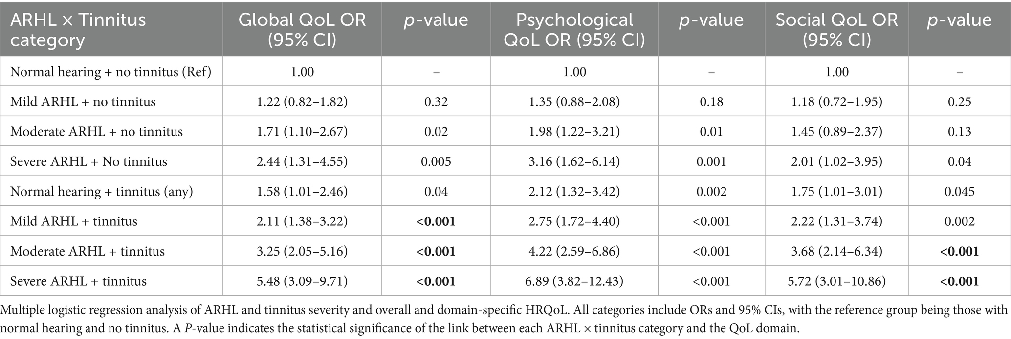 Table 4. Multiple logistic regression of combined ARHL and tinnitus severity in relation to global and domain-specific HRQoL.