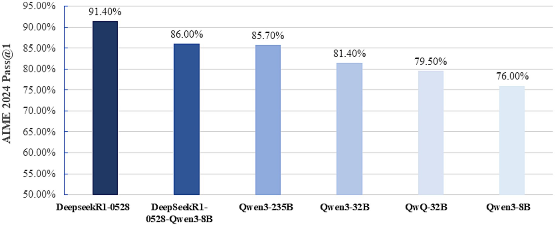 Figure 2. Performance of Chinese large language models on the 2024 American Invitational Mathematics Examination. AIME, American Invitational Mathematics Examination;pass@1, proportion of correct answers at the first attempt (%).