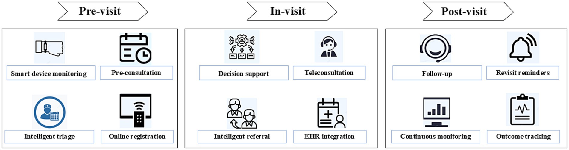 DeepSeek supported a closed-loop primary care model, comprising pre-visit AI-assisted triage and data collection, in-visit clinical decision support and teleconsultation, and post-visit follow-up with automated reminders and continuous monitoring (23). Its intelligent health management system incorporated the latest clinical evidence and guidelines, enabling adaptive and individualized care, particularly for chronic disease management in community populations (23). The platform delivered targeted health education and real-time care recommendations, which promoted healthier lifestyles and facilitated timely clinical interventions (Figure 3) (23).
