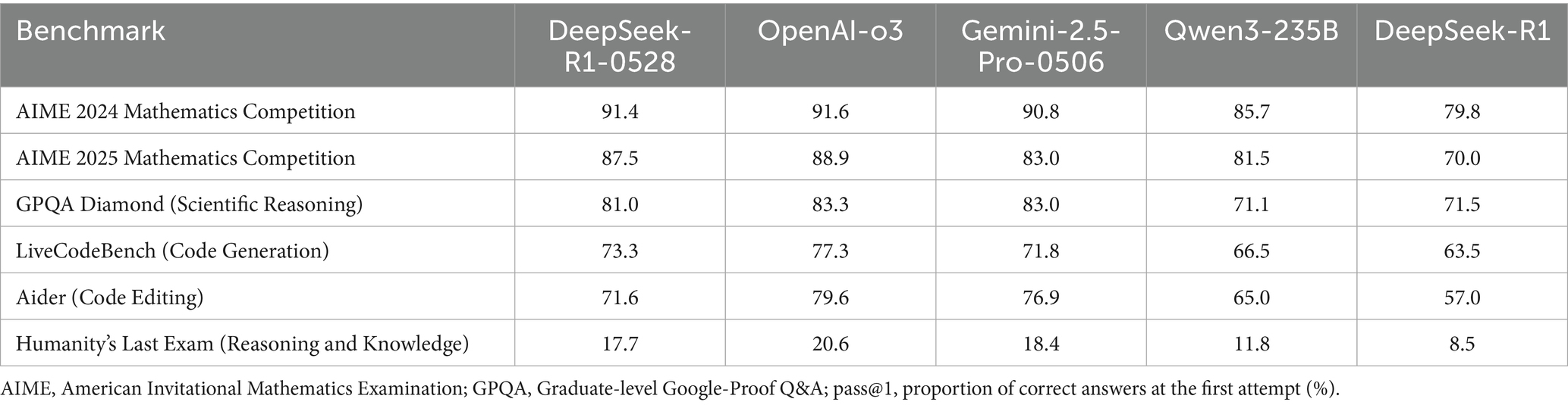 DeepSeek is an open-source platform licensed under the Massachusetts Institute of Technology (MIT) framework, providing a cost-effective alternative to proprietary AI systems (18). Its exceptional inferential capabilities derive from a Mixture-of-Experts architecture, reinforcement learning from human feedback (RLHF), an FP8 mixed-precision framework, and a multi-stage training regimen (18). In benchmark evaluations, DeepSeek-R1 outperformed both Generative Pre-trained Transformer (GPT-4o) and OpenAI’s o1 reasoning model (see Table 1) (19). Its capabilities extended into multimodal AI with the Janus-Pro-7B variant (11). DeepSeek demonstrated superior performance compared with other Chinese AI models (see Figure 2) (20).