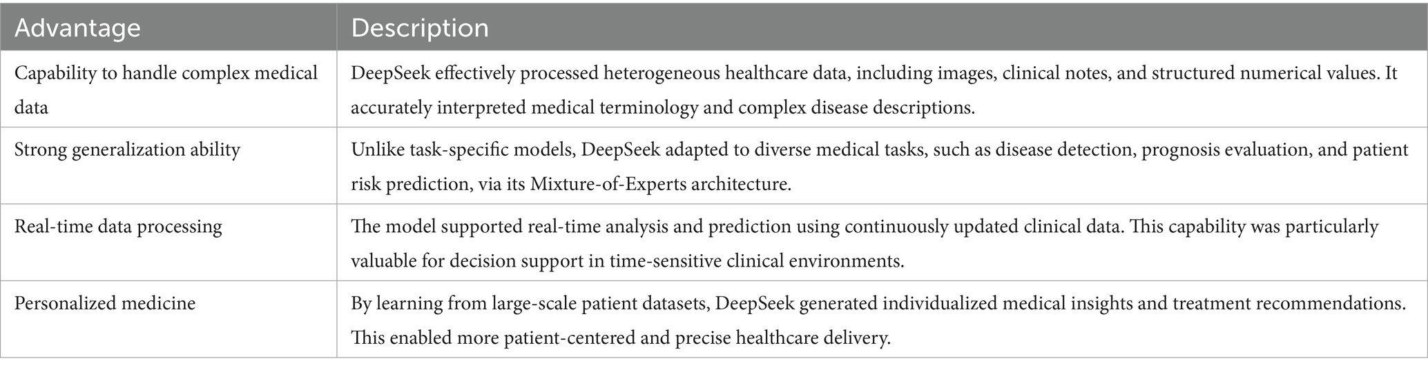 DeepSeek provided real-time responses to health inquiries, offered guidance on personalized health planning, and delivered preventive recommendations (35). The system supported individuals with varying levels of health literacy through empathetic interactions and extended services to underserved populations. DeepSeek was free and available in multiple formats, including a web version, mobile applications, and a desktop client (11). By enabling scalable access to both health information and emotional support, DeepSeek complemented traditional healthcare delivery and enhanced patient engagement across diverse communities.