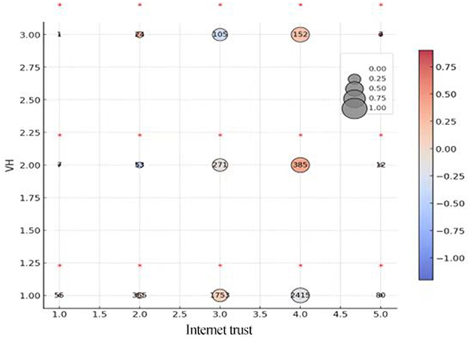 Figure 6. Level of vaccine hesitation and type of trust. This figure shows a bar graph and 5 contingency tables that follow the scale located in the upper right section of the figure. (a) Respondents' approach to COVID-19 vaccines. (b) Distribution of vaccine hesitancy on Generalized trust. (c) Distribution of vaccine hesitancy on government trust. (d) Distribution of vaccine hesitancy on doctor trust. (e) Distribution of vaccine hesitancy on internet trust. The numbers inside the circles show the absolute frequency, the size of the circle indicates the proportion relative to the level of VH, and the color of the circle shows the value of the standardized residuals of the Chi-squared for each cell. The standardized residuals whose value is higher than 2 or lower than−2 are considered as significant differences and are highlighted with an asterisk above the circle.
