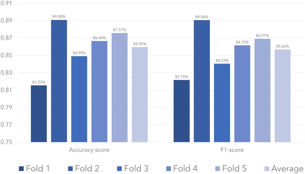 It was observed that the algorithm produced sensitivity of 91% and a specificity of 90% in the measurements made on the test data. The F1 score was measured as 0.89 for the best fold. The algorithm most successfully distinguished emergency results. In order to evaluate the performance of the model, we performed K-fold cross-validation, where it was observed that with an average of 0.85 F1 score, residing within well-performing model values, i.e., 0.80–0.90. The accuracy folds along with the F1 scores are given in Figure 3 below: