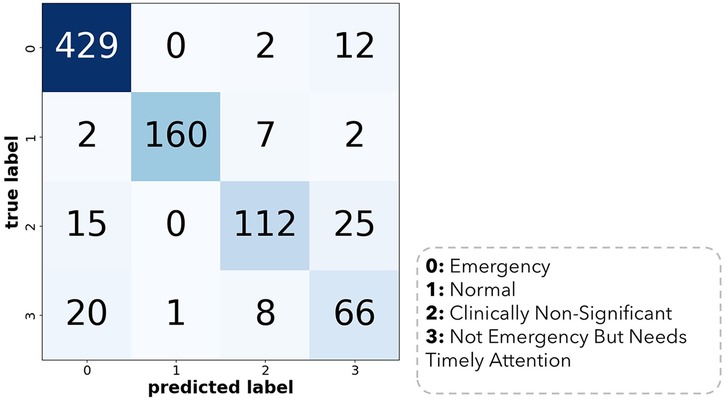 We first evaluate the representativeness (i.e., data coverage) of our prepared dataset. As per sociodemographic data, most of the participants had age range 19–35 years making 30% of the total population, with male subjects dominating the percentage (58%). Majority of the patients (40%) had no comorbidities and were mostly (80%) of Turkish nationality as tabulated in Table 1. To train the Distil BERT text classifier, we use the Adam optimizer with a learning rate of 2e-5 and a batch size of 32 alongside a cross-entropy loss function. A dropout rate of 0.1 was used to avoid overfitting. The training was made for 10 epochs, with early stopping being based on the validation loss. The training was processed on NVIDIA V-100 GPU, and it took about 4 h to complete. The model performance was assessed using accuracy, F1 score, and recall features. We performed five-fold cross-validation with a split ratio of 4:1:5 for training, validation, and testing, respectively. The trained classifier attained a mean F1 score of 0.85 across the entire folds, as shown in Figure 1. Out of 861 testing samples, 702 were correctly predicted with an overall accuracy of 81.5%. Class 3 has the highest misclassification rate. The confusion matrix for different classes is provided in Figure 2. We observe that the algorithm produced has a sensitivity of 91% and a specificity of 90% in the measurements made on the test data. The F1 score was measured as 0.89 for the best fold residing within well-performing model F1 scores, i.e., 0.80–0.90. We also highlight that in the worst-case scenario, the model can predict decently with approximately 0.81 F1 score. The best-performing model across the folds most successfully distinguished emergency results. However, in medical practice, false-negatives for the emergency class should be strictly avoided. Therefore, the model with the least false negative emergency cases should be preferred. The average recall value of 0.89 (moderate recall, 0.70–0.90) indicates that our model is able to indicate most of the actual positive instances, but a moderate number of false negatives indicates a better performance of the model as shown in Figure 1.