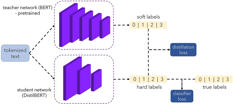 We are engrossed in categorizing text-based radiology reports into the four predefined classes. The task includes text classification of radiology reports rather than direct image classification. To implement our text classification approach on the prepared emergency room dataset, we adapted a large language model DistilBERT, a version of BERT with six transformer layers, 768 concealed units, and twelve attention heads. Researchers often use it for text organization by adding a fully connected output layer with soft-max activation to predict the urgency category. It contains around 66 million trainable parameters, in addition to the transformer layers and a fully coupled output layer. DistilBERT is proven to achieve efficiency without sacrificing accuracy (12). This lightweight model, compared to its counterpart BERT (13), is trained with a knowledge distillation technique to enable the same information to be learned with much fewer learnable parameters (14). Knowledge distillation, also known as the teacher-student framework incorporating two models, student network and teacher network, respectively. As shown in Figure 3, in knowledge distillation, DistilBERT is the student network that learns information from BERT as the teacher and becomes a smaller model (DistilBERT) that repeats the teacher's behavior (12, 15). The BERT (teacher) is already pre-trained; then, we train Distil BERT (student) learning to make predictions in a different context than the teacher. Moreover, we benefit from this feature, since our inputs and expected predictions have a medical context. We first tokenize (i.e., splitting the text into substrings containing multiple words) the text data by using the Distil BERT tokenizer with sequences amplified to a maximum length of up to 512 tokens. Next, we train a text classifier model with the Distil BERT backbone and then evaluate the classification results. All the data was split into three and tested with five-fold cross-validation: 689 reports for training, 172 for validation, and 861 reports reserved for testing (i.e., with a split ratio of 4:1:5). The trained classifier then tested on the remaining 861 annotation reports.