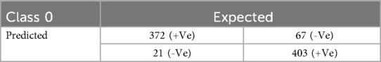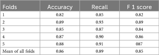 The average recall value of 0.89 (moderate recall, 0.70–0.90) indicates that our model is able to indicate most of the actual positive instances, but a moderate number of false negatives indicate a better performance of the model, as given in the Table 3 below.