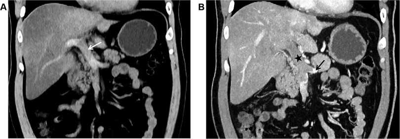 Figure 1. (A) In case 1, the non-contrast CT scan in the coronal plane of the abdomen shows widening of the main portal vein trunk (arrow), with unevenly increased density within the lumen, blurred margins of the vessel wall, and indistinct surrounding fat planes. (B) In Case 1, The CT scan with contrast during the portal venous phase in the coronal plane reveals filling defect changes in the main portal vein trunk (black star), along with the left branch and right branch, indicating complete occlusion of the lumen. The splenic vein (black arrow) is also involved, and no enhancement changes are noted in the filling defect area. The liver parenchyma exhibits reduced density, with significantly weakened enhancement post-contrast.