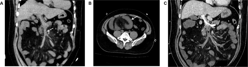 Figure 2. (A) In case 2, the non-contrast CT scan in the coronal plane of the abdomen displays enlargement of the superior mesenteric vein, with unevenly increased internal density, blurred vessel wall margins, and swelling of the surrounding mesentery (arrow). (B) In Case 2, The non-contrast CT scan in the axial plane shows thickening and swelling of the ileal wall, with increased density of the mucosal surface, and no dilation of the intestinal lumen. The serosal surface appears blurred, with associated mesenteric swelling, and fluffy shadows surrounding the blood vessels (arrow). (C) In Case 2, The CT scan with contrast during the portal venous phase in the coronal plane demonstrates filling defect changes within the superior mesenteric vein and the main portal vein trunk (black star). The superior mesenteric vein is completely occluded, and the main portal vein trunk is narrowed by approximately 50%, with no enhancement changes observed in the filling defect area. The thickened mucosal surface of the small intestine wall shows persistent enhancement, and a small amount of fluid is present around the liver.