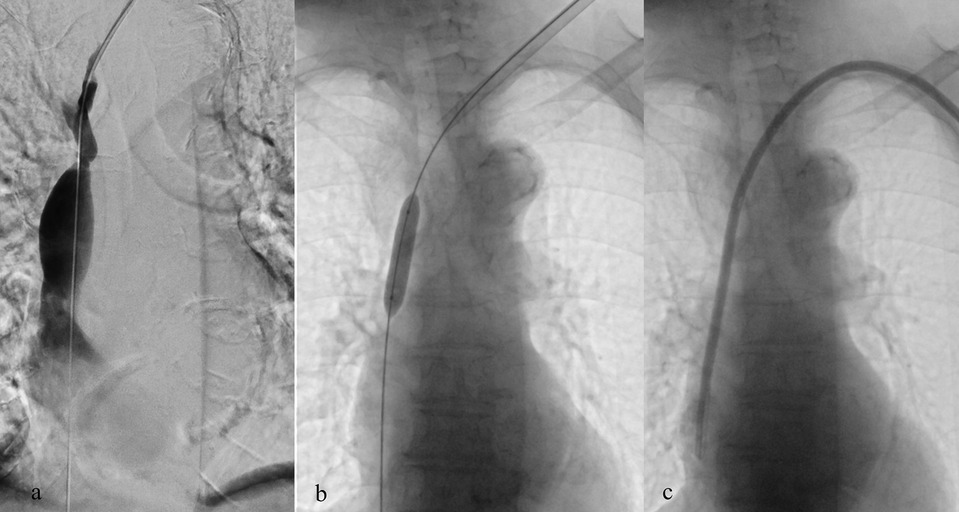 Figure 2. Placement of a TCC through the left internal jugular vein in a patient with significant stenosis of the left brachiocephalic vein (a); balloon angioplasty performed at the stenotic tract (b) and successful placement of TCC (c).