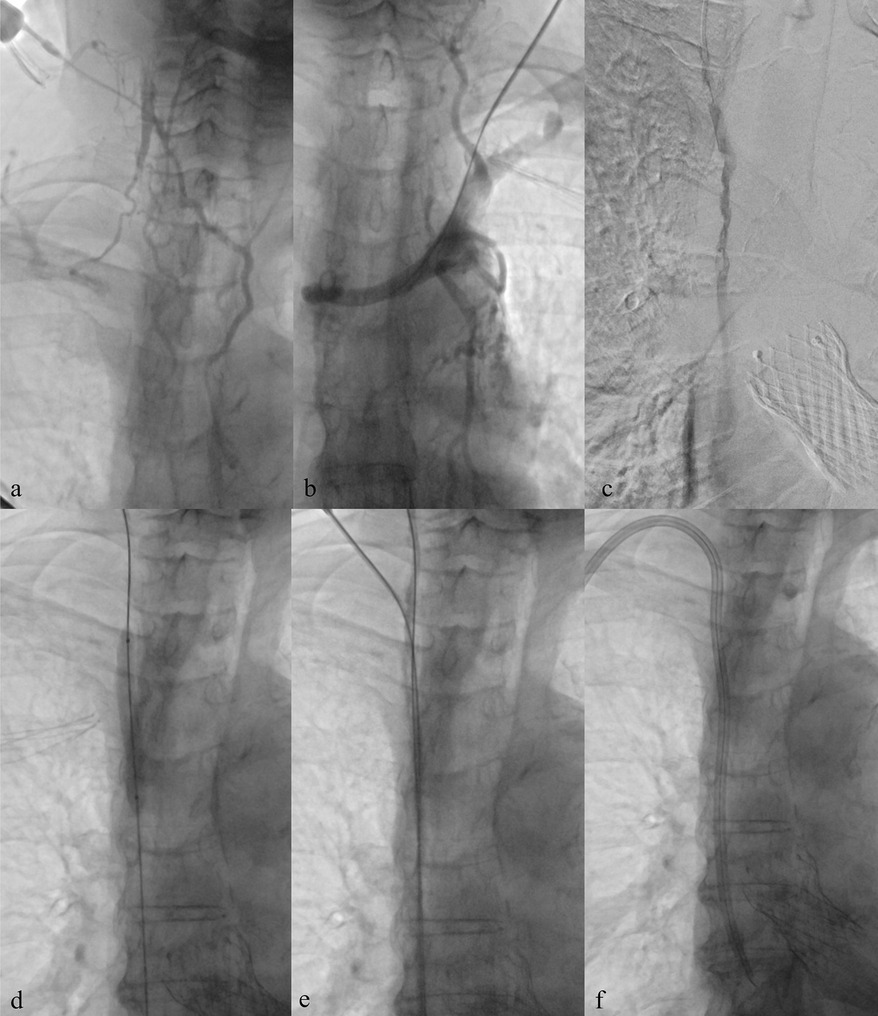 Figure 3. Central venous recanalization and tunneled catheter placement. (a) Diagnostic venography from a high puncture of the patent right internal jugular vein using an angiocath shows proximal occlusion of the right internal jugular vein with extensive collateral circulation, related to previous TCC. (b) Diagnostic venography through a 5 Fr introducer confirms occlusion of the left brachiocephalic vein, also due to prior TCC. (c,d) Recanalization of the occluded tract using a 0.035″ hydrophilic guidewire followed by balloon angioplasty. (e,f) Low puncture of the recanalized right internal jugular vein and successful placement of a new TCC.