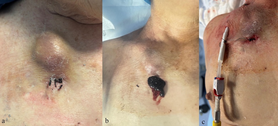 Figure 4. Clinical images of a complication after removal of a tunneled central venous catheter. (a,b) Hematoma at the exit-site with subsequent surgical evacuation. (c) Placement of a new tunneled central venous catheter at a different site.