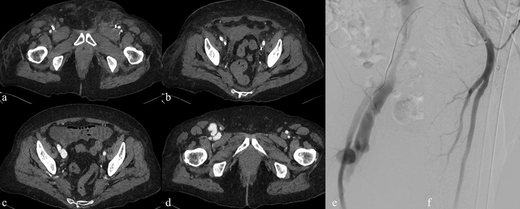 Figure 5. Imaging findings of a vascular complication related to temporary femoral central venous catheter placement for dialysis. (a,b) Contrast-enhanced CT showing a temporary dialysis catheter correctly positioned within the iliac vein but with inadvertent passage into the superficial femoral artery (circle). (c,d) Follow-up CT after catheter removal demonstrating the development of a pseudoaneurysm (arrow) and an arteriovenous fistula. (e,f) Digital subtraction angiography confirming the vascular injury and subsequent treatment with covered stent placement.