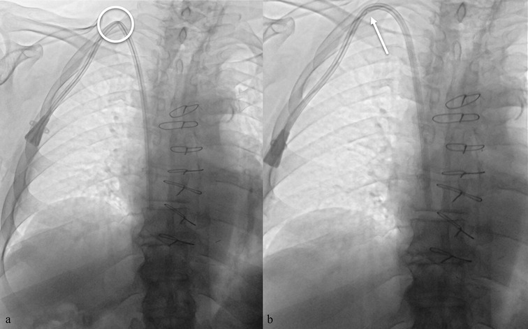 Figure 6. (a) malposition of a TCC with evidence of kinking along the subcutaneous course (circle). (b) Attempted repositioning by gentle device retraction, with persistence of a mild indentation (arrow).