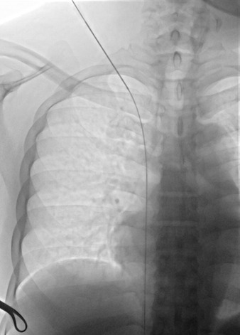 Figure 7. Fluoroscopic chest image in the supine position showing a low puncture site at the superior margin of the clavicle, with subsequent advancement of the guidewire from the superior vena cava directly into the inferior vena cava. The image highlights the anatomic relationship between the puncture site and the clavicle, an important landmark for safe and accurate venous access.