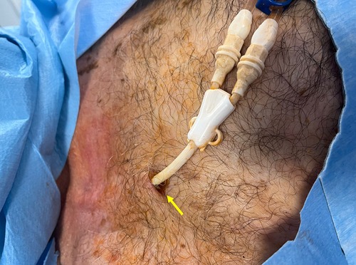 Figure 8. Exit-site infection of a tunneled cuffed catheter (TCC). Clinical image showing erythema, induration, and purulent discharge at the exit-site (yellow arrow). Exit-site infections are among the most common early complications of TCCs, and if not promptly recognized and treated, they may progress to tunnel infection or CRBSI.
