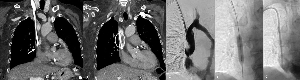 Figure 9. (a,b) Pre-removal CT of a TCC showing stenosis at the junction of the SVC and AD (arrow), associated with circumferential thrombotic deposition (circle). (c) Diagnostic venography performed via a 7 Fr introducer after TCC removal confirming CT findings, with collateral drainage through the hemiazygos vein. (d,e) Balloon angioplasty of the stenotic tract followed by successful placement of a new TCC.