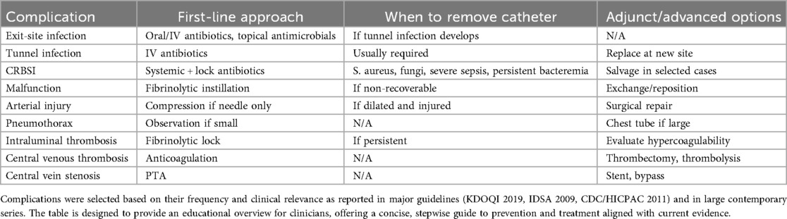 Table 2. Summary of the most relevant TCC complications, with corresponding first-line management, escalation strategies, and indications for catheter removal.