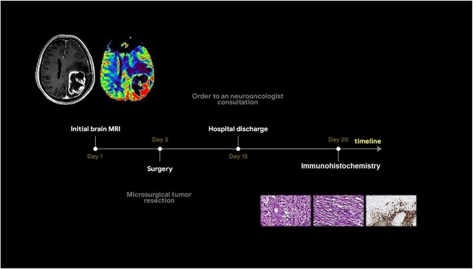 Based on the tumor's location and contrast enhancement pattern, the differential diagnosis mainly included solitary metastasis or malignant diffuse glioma but also considered the possibility of anaplastic meningioma. Because of the midline shift syndrome and progressive neurological deterioration posing a life-threatening risk, a microsurgical resection of the mass was performed. The surgical specimen was submitted for a pathomorphological examination. A microscopic analysis identified a rare variant of gliosarcoma characterized by a biphasic pattern: a glial component (Figure 1g) exhibiting marked nuclear polymorphism, cellular atypia, and hyperchromatic nuclei and a sarcomatous component (Figure 1h) composed of spindle-shaped cells arranged in fascicles and interspersed with argyrophilic fibers. An immunohistochemical analysis of the glial fibrillary acidic protein (GFAP) revealed a strong positive expression in the glial component of the tumor (indicated by a red arrow in Figure 1i) and a complete absence of expression in the sarcomatous component (marked by a green arrow in Figure 1i). The patient was discharged in satisfactory condition on the 15th postoperative day and referred to a neuro-oncologist at the Multidisciplinary Clinical Medical Center “Medical city” to determine further treatment strategies and initiate chemoradiotherapy. The diagnostic process of the patient is illustrated in Figure 2.