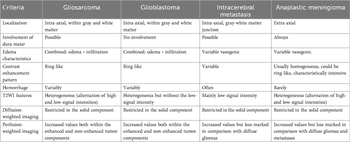 The implementation of specialized mpMRI protocols has been conclusively demonstrated to enhance diagnostic accuracy in the differentiation of CNS tumors. However, diagnostic interpretation becomes challenging when tumor nodes are situated adjacent to the corticomedullary junction, particularly in cases lacking definitive white matter involvement (9, 19). In such scenarios, a comprehensive integration of all imaging sequences—including conventional T2WI that may otherwise be overlooked—is critical for accurate assessment. The clinical case of a rare glioblastoma variant exemplifies the diagnostic utility of conventional T2WI, which revealed the intratumoral heterogeneity characteristic of gliosarcoma. This heterogeneity manifested as coexisting regions of hyperintense and hypointense MR signals, a phenomenon attributable to the tumor's biphasic histopathological composition. Specifically, the hyperintense regions correspond to glial components with astrocytic and anaplastic cellular morphology, while hypointense areas reflect densely packed mesenchymal cells. Furthermore, the intermingling of gliomatous and sarcomatous infiltrates creates a distinct irregular pattern characterized by alternating zones of hypointense and hyperintense signals. This imaging signature, arising from the juxtaposition of divergent cellular lineages, is characteristic of gliosarcoma and absent in other CNS neoplasms, thereby underlining its differentiation. Several case series have highlighted one of the typical characteristics of GS—the involvement of the meninges (9, 20). The aforementioned imaging features collectively support the presumptive diagnosis of gliosarcoma during initial diagnostic evaluation, providing critical preoperative data to guide neurosurgeons in optimizing their surgical strategy (21). These radiological findings enable a preoperative delineation of tissue resection boundaries within defined anatomical zones, anticipating the tumor's heterogeneous histological composition during microsurgical intervention. A comparison of the neuroimaging characteristics of the discussed neoplasms is presented in Table 1.