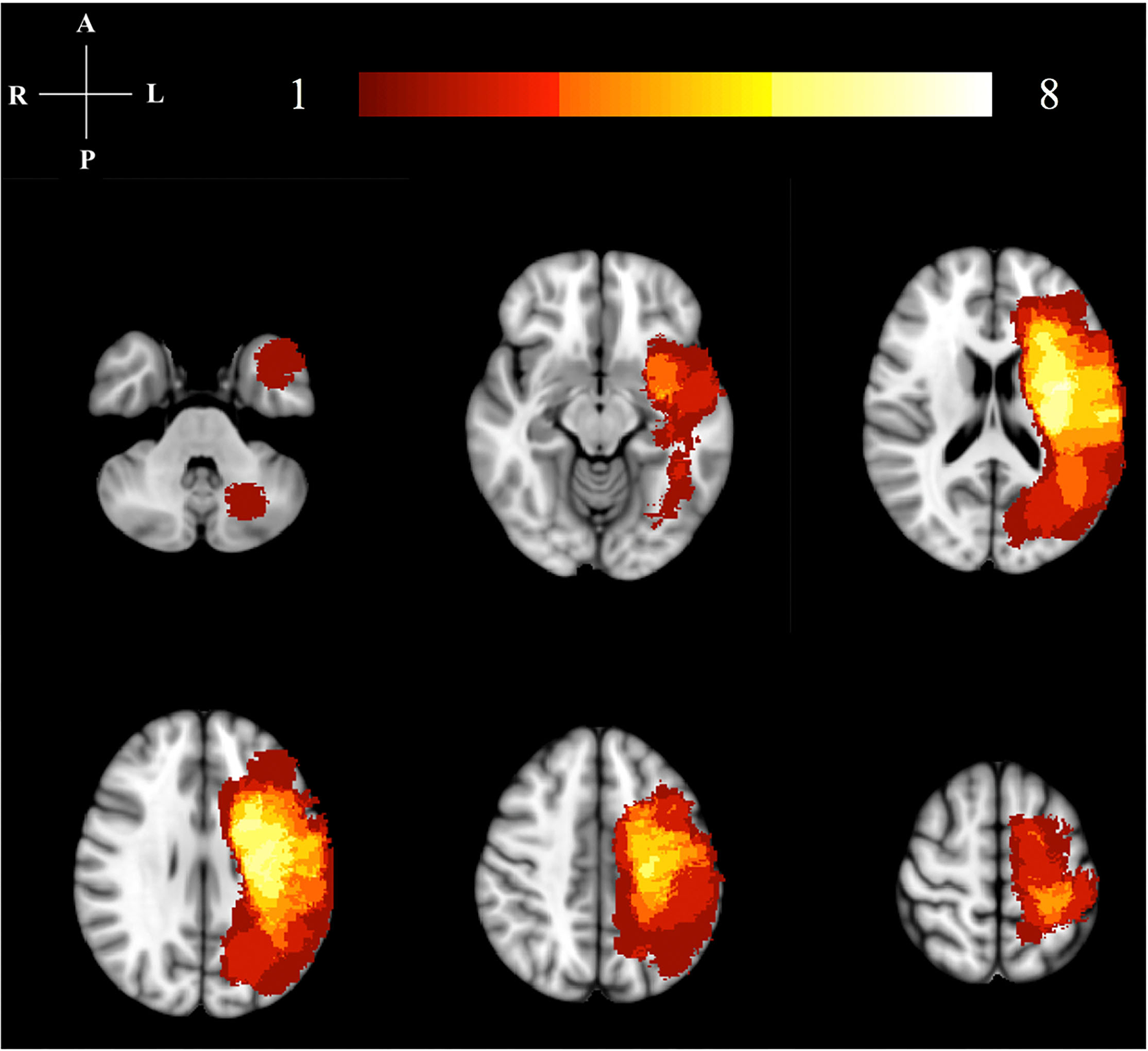 Lesion location map. This image illustrates the lesion distribution for our study. The color bar and numbers represent the number of subjects with a lesion in that area. The highest lesion distribution in shown in bright colors (yellow/white). All right hemisphere lesions have been flipped to the left hemisphere for analysis.