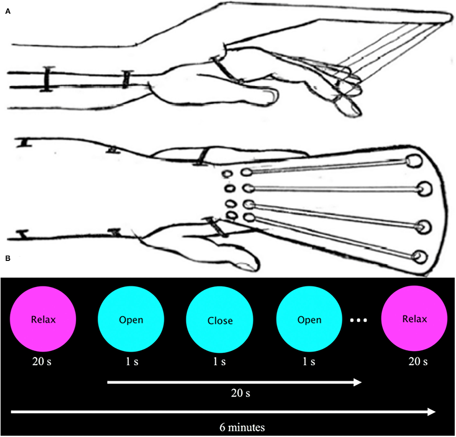 (A) Sketch of assistive finger extension device. This device assists finger extension of stroke participants with spasticity via elastic bands (Theraband: 10.7 N resistance at 100% elongation, 15.1 N at 200%) that are supported by an outrigger on the dorsal part of the hand. Velcro straps attached to the patient's first four digits and were connected to an elastic band. A plastic brace served to stabilize the participant's forearm and wrist as they were instructed to flex and extend the digits. (B) Visual presentation prompt. The visual prompt was presented on a screen inside the bore and read “Relax” centered in a magenta circle (20 s) and “Open/Close” centered on a cyan circle (20 s, 1 Hz) for 6 min.